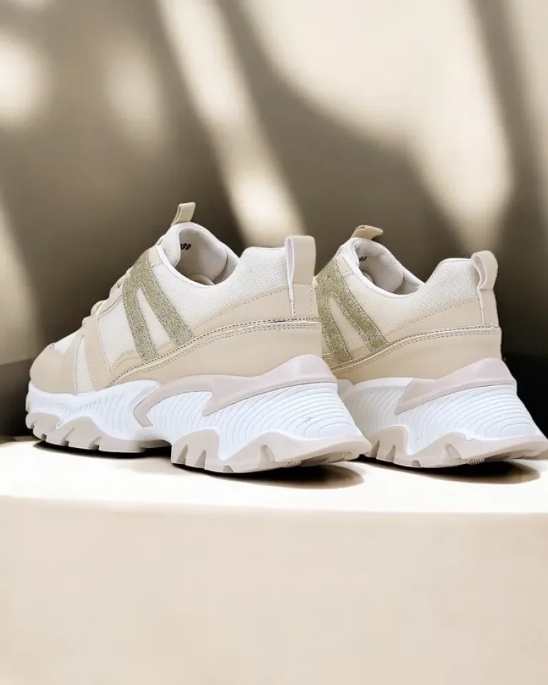 - Damskie buty sportowe typu sneakersy na platformie. Obuwie jest wykonane ze skóry ekologicznej z brokatowymi wstawkami oraz tkaninową wkładką. Super dodatek do twoich codziennych outfitów w stylu casual!
