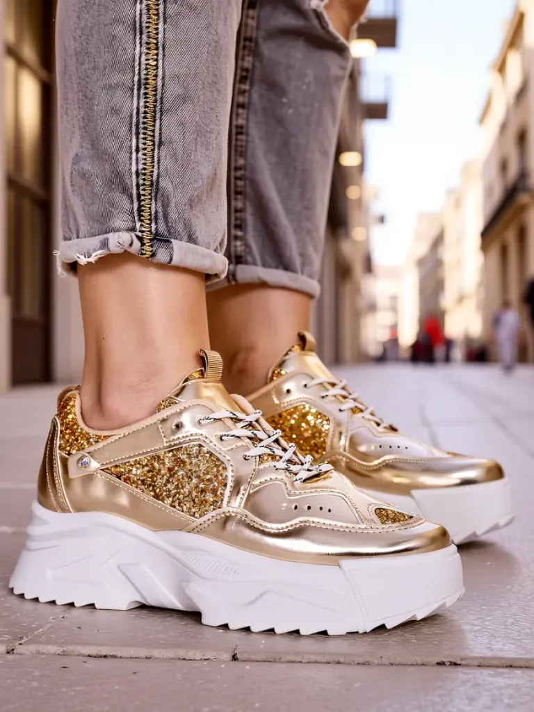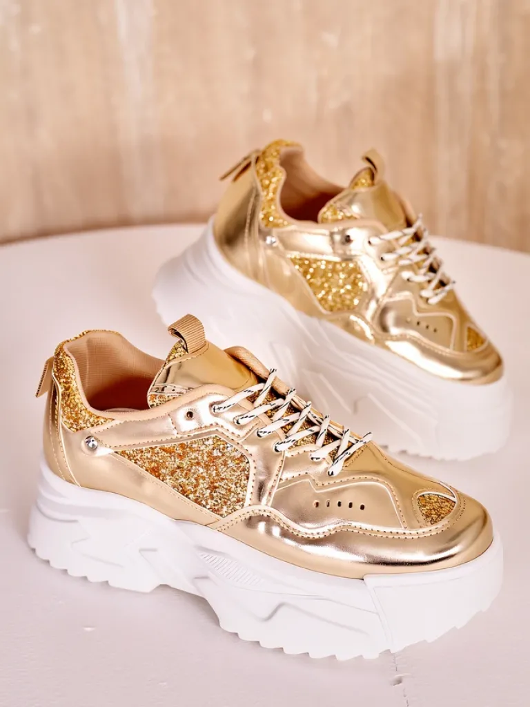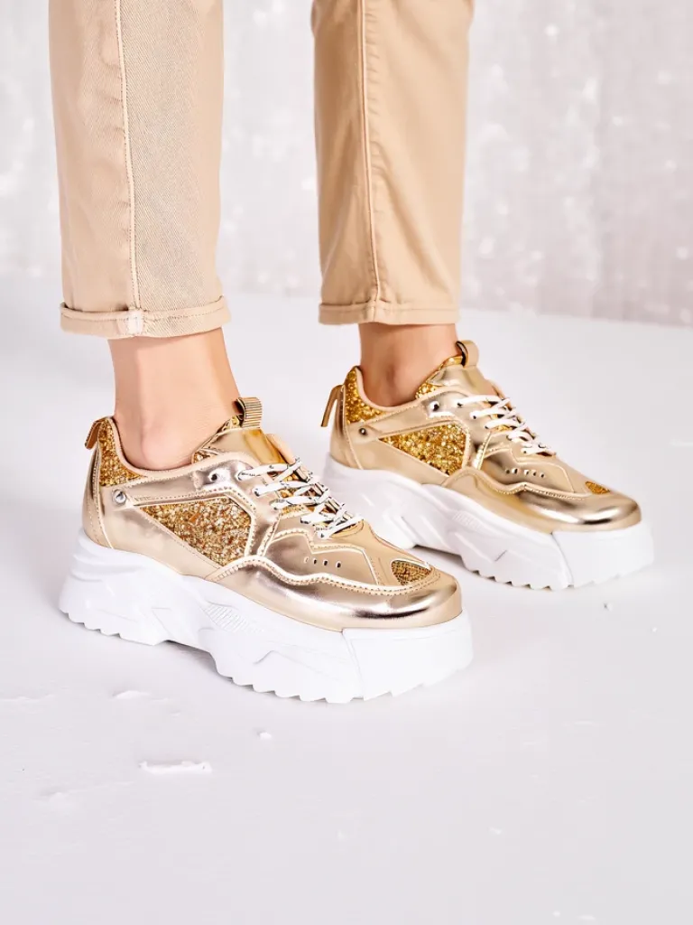 - Damskie buty sportowe typu sneakersy na płaskiej podeszwie. Wykonane ze skóry ekologicznej z brokatowymi wstawkami. Wkładka to eko skóra. Super dodatek do twoich codziennych outfitów w stylu casual!