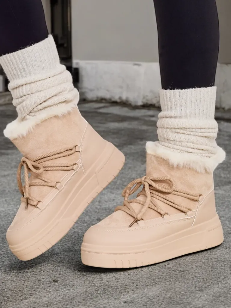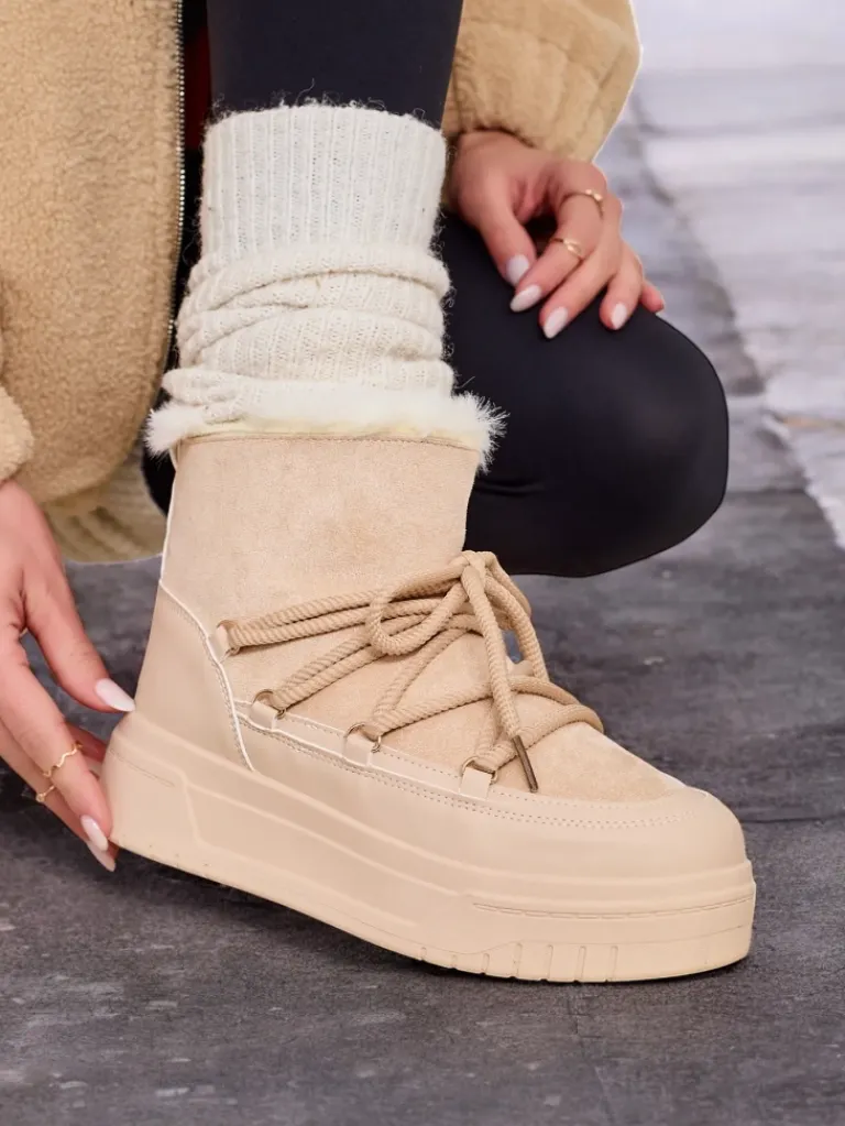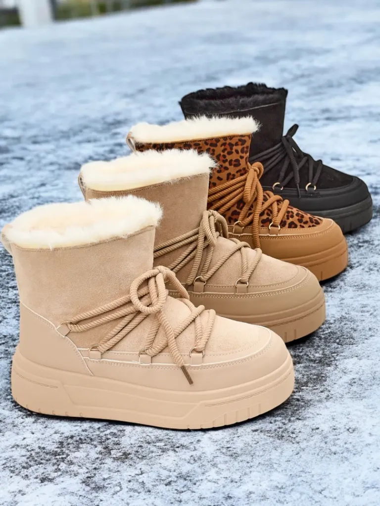 - Damskie obuwie typu śniegowce z cholewką wykonaną z połączenia eko skóry oraz materiału tkaninowego. W środku przyjemne futerko, obuwie wsuwane i sznurowane. Idealne na zimę!