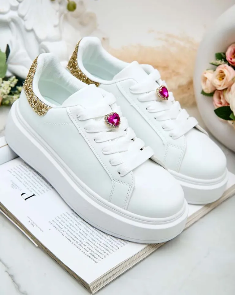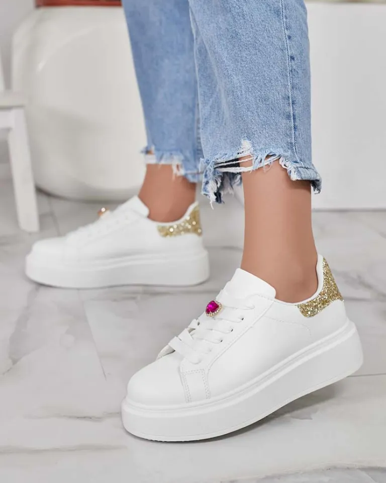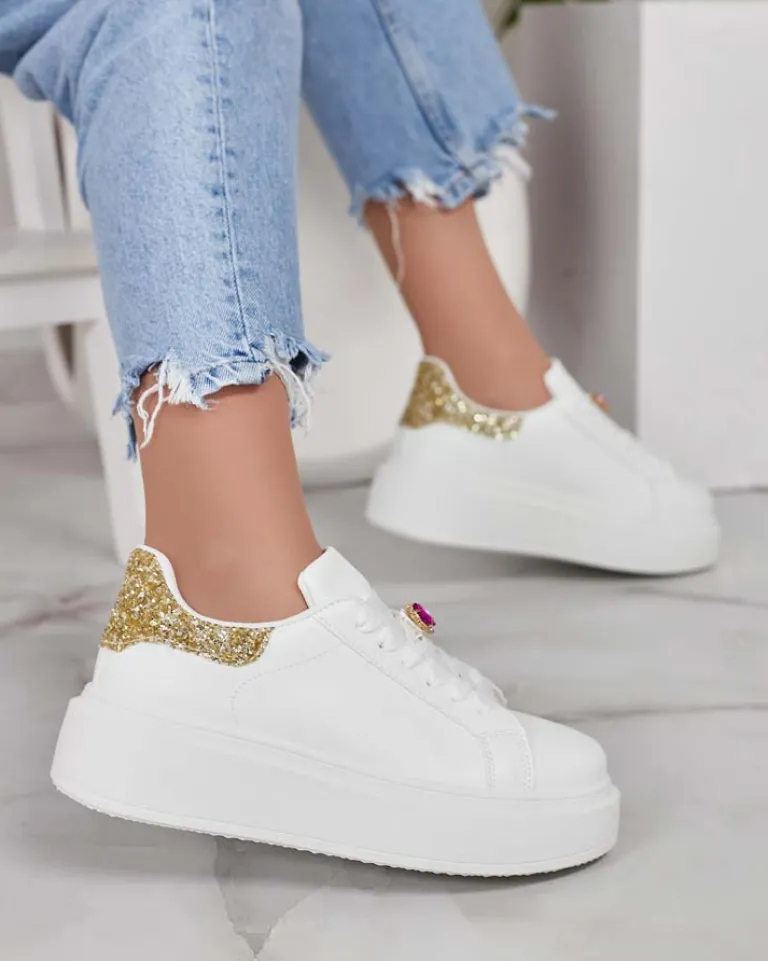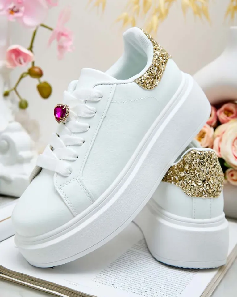- Eko skórzane sneakersy damskie na platformie – perfekcyjne połączenie stylu i komfortu. Model sznurowany, posiada brokatowe wykończenie. Idealne dla aktywnych osób!