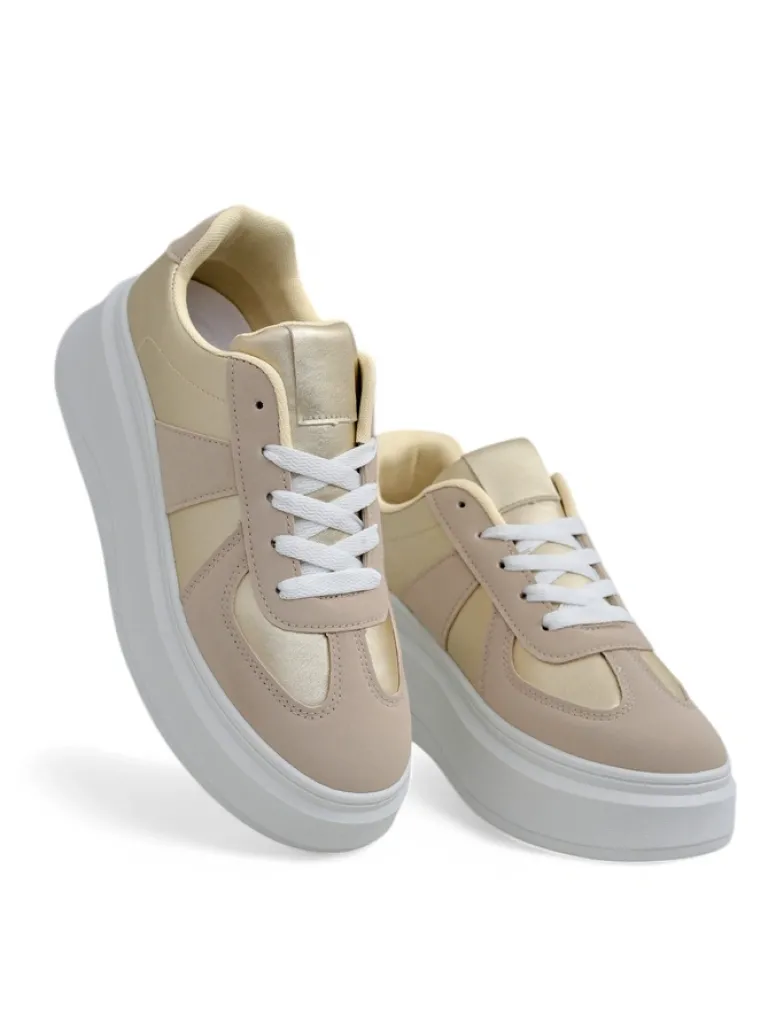 - Sneakersy damskie na platformie – perfekcyjne połączenie stylu i komfortu. Obuwie wykonane z eko skóry. Model sznurowany, posiada tkaninową wkładkę. Idealne dla aktywnych osób!