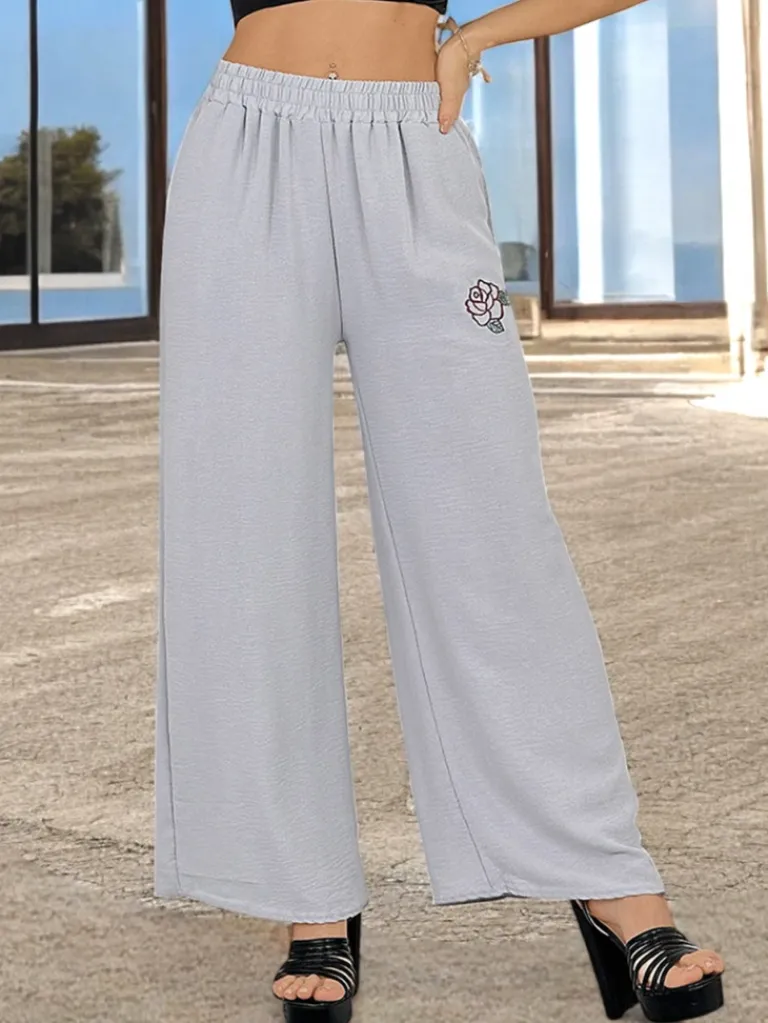 - Gustowne szerokie spodnie wykonane z lekkiej tkaniny, model posiada gumę w pasie i ozdobną naszywkę. Hit tego sezonu! UWAGA: Dokładność pomiaru (+/-) 1 cm.