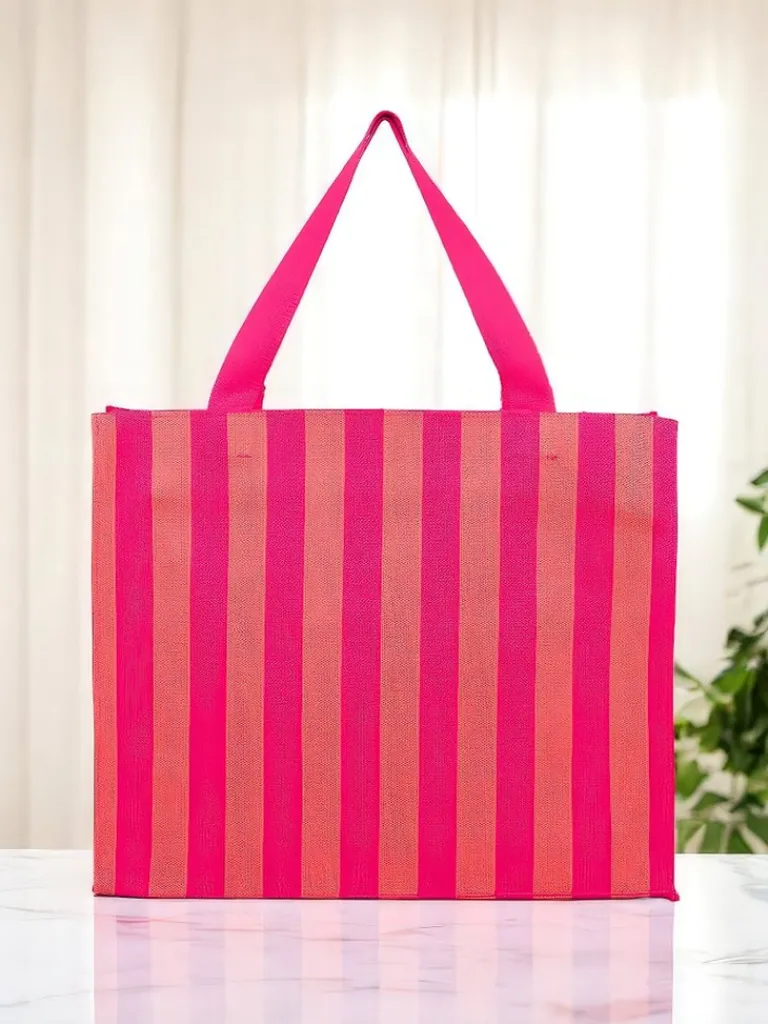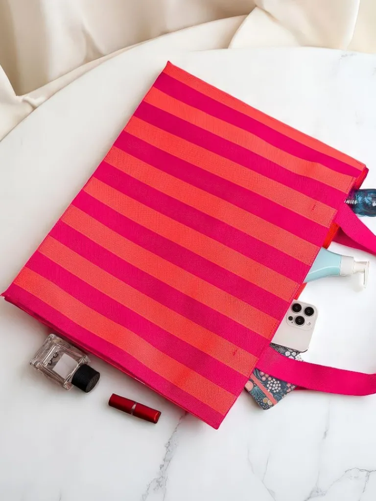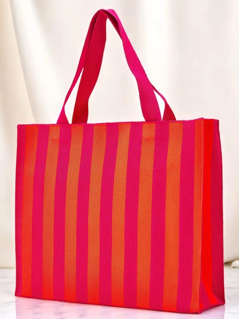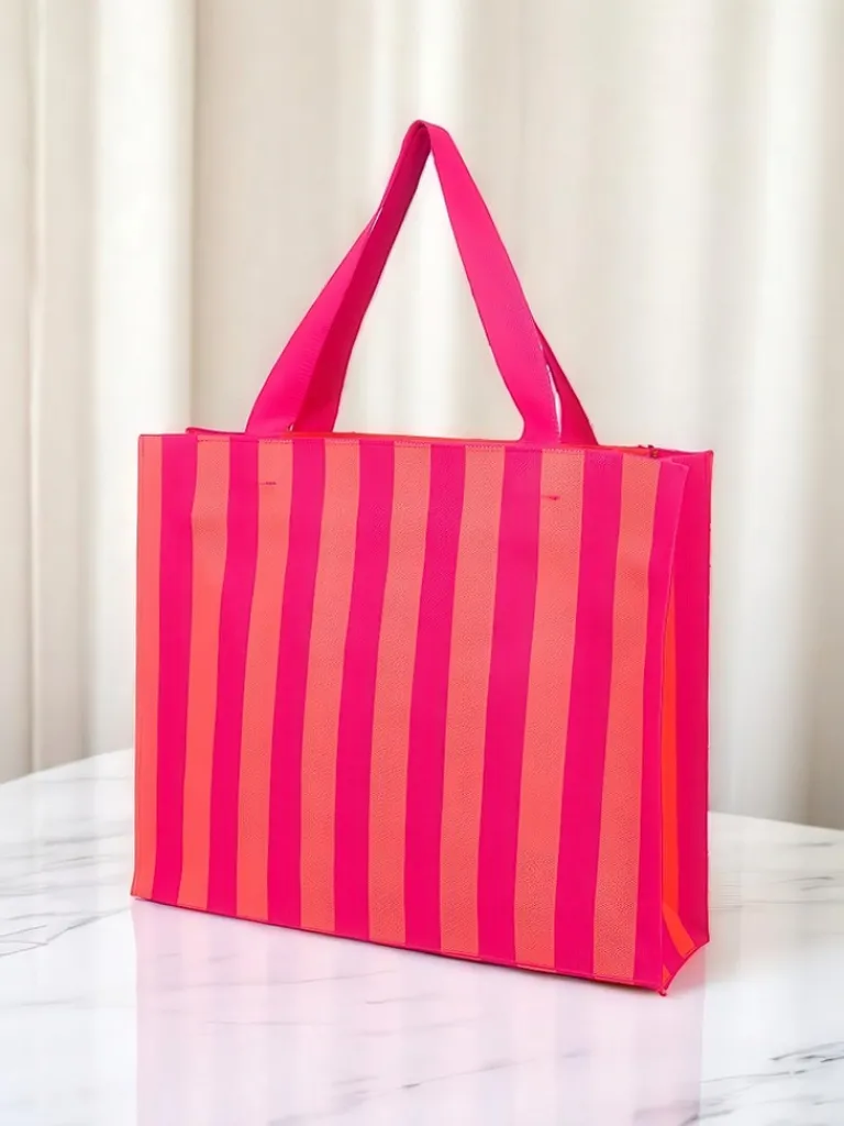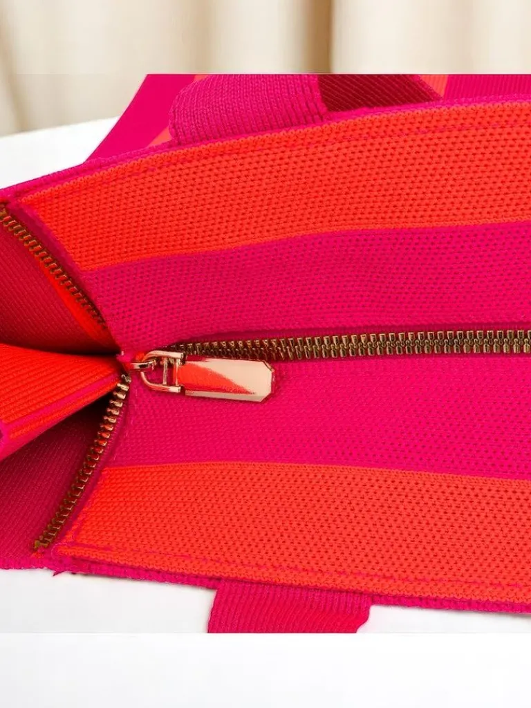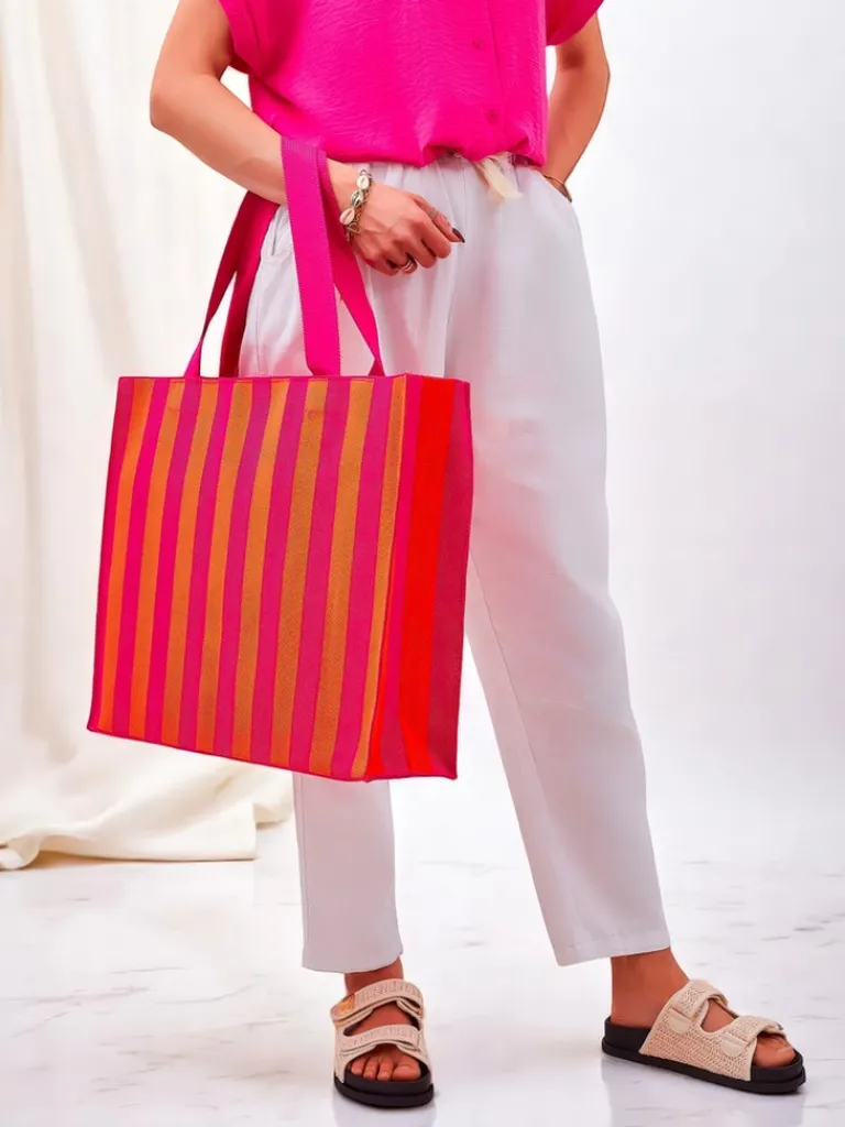 - Duża, materiałowa torebka damska z paskami w odcieniach pomarańczu i różu. 1 komora, zamek. Lekka, pojemna i idealna na lato oraz kolorowe stylizacje!