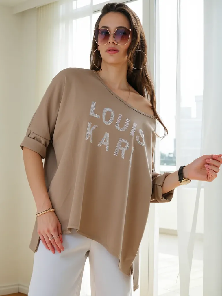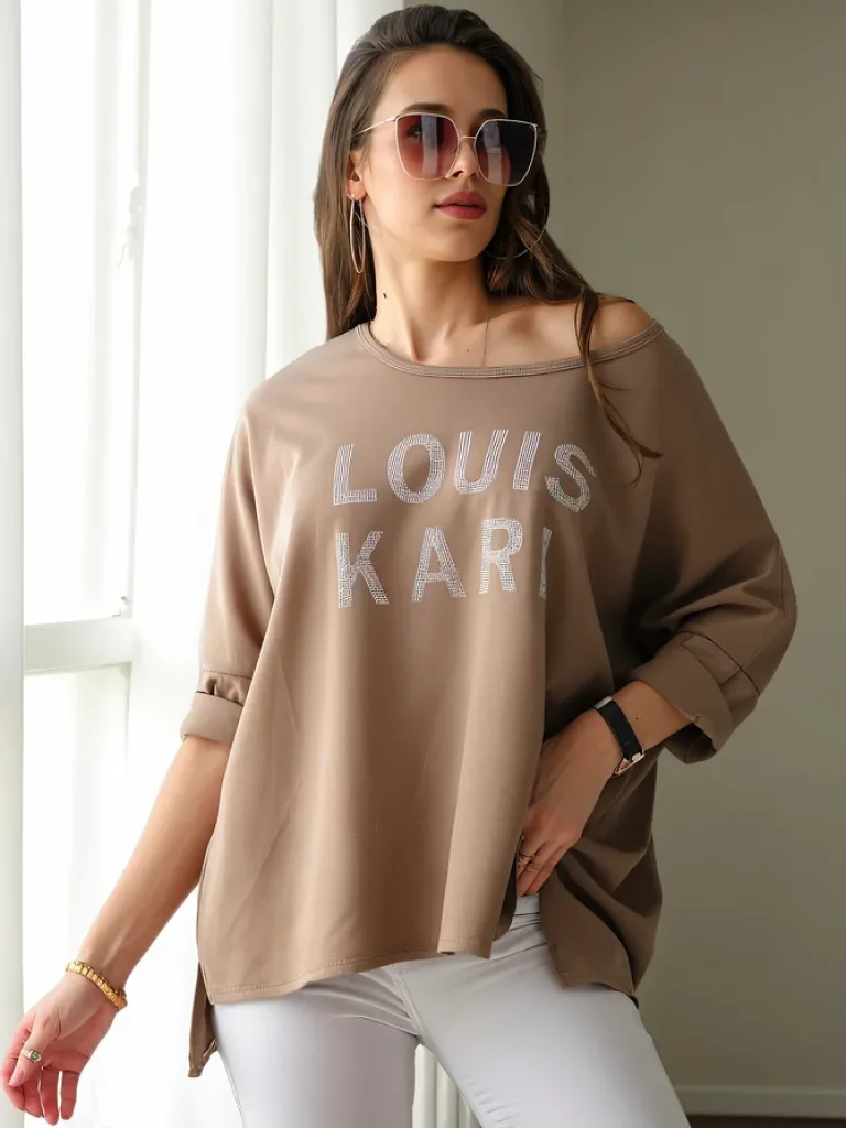- Oryginalna damska bluzka z okrągłym dekoltem, uszyta z miękkiej i przyjemnej w dotyku tkaniny. Całość zdobiona subtelnym napisem z cyrkonii, a długi rękaw dodaje lekkości. Doskonały wybór do tworzenia modnych i stylowych zestawów!