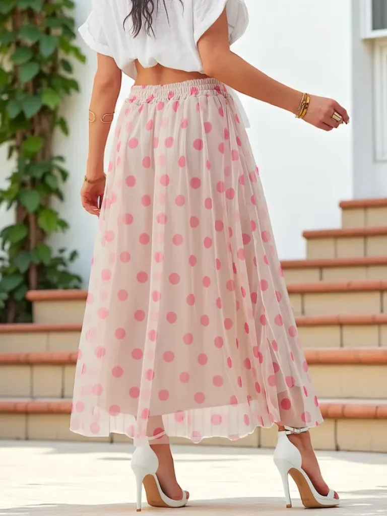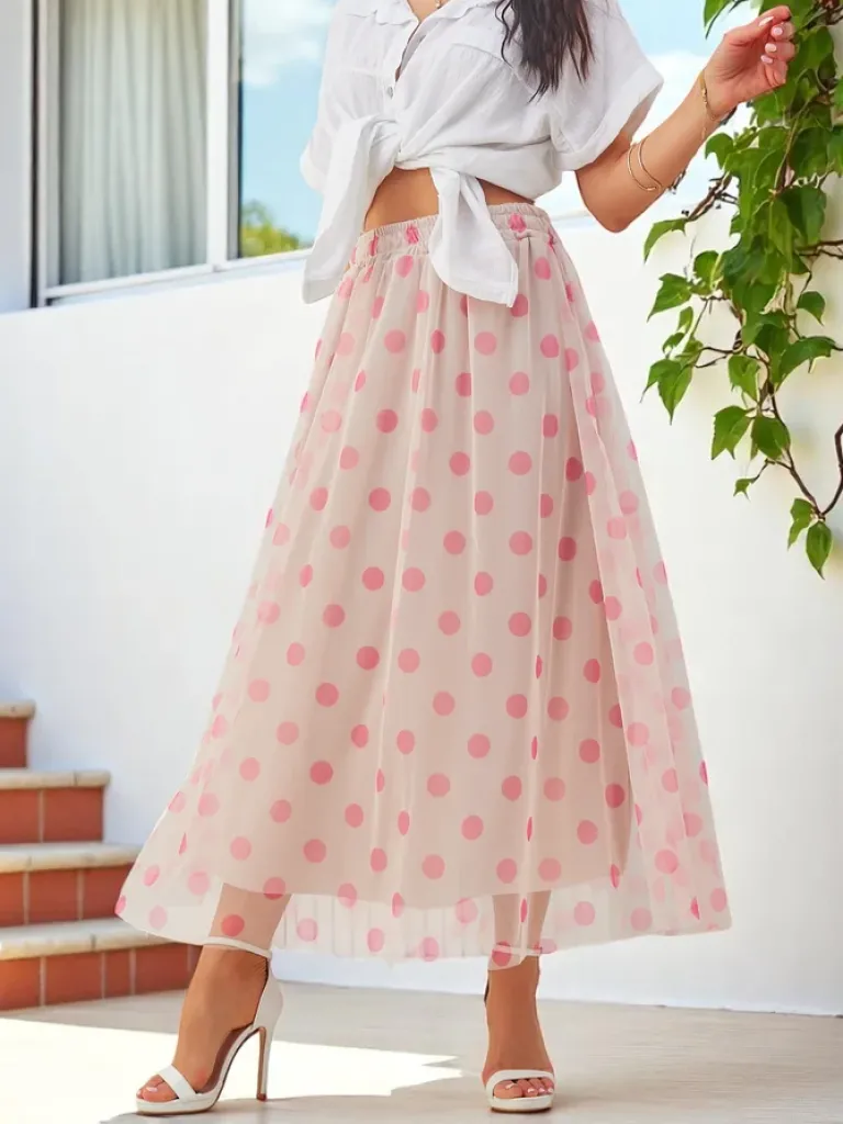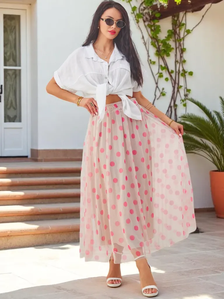 - Elegancka i kobieca spódnica midi wykonana z lekkiej wiskozy, wykończona warstwą tiulu w delikatne kropeczki. Idealna na co dzień i na specjalne okazje – łączy wygodę z romantycznym stylem. UWAGA: Dokładność pomiaru (+/-) 1 cm.