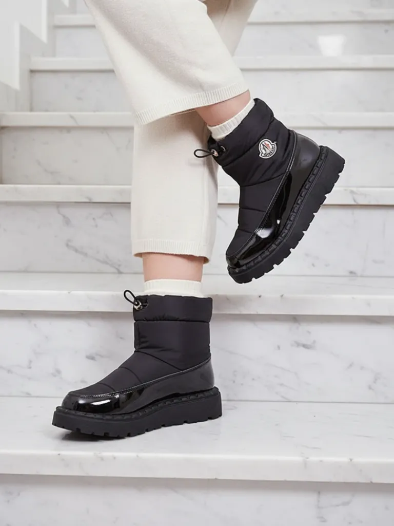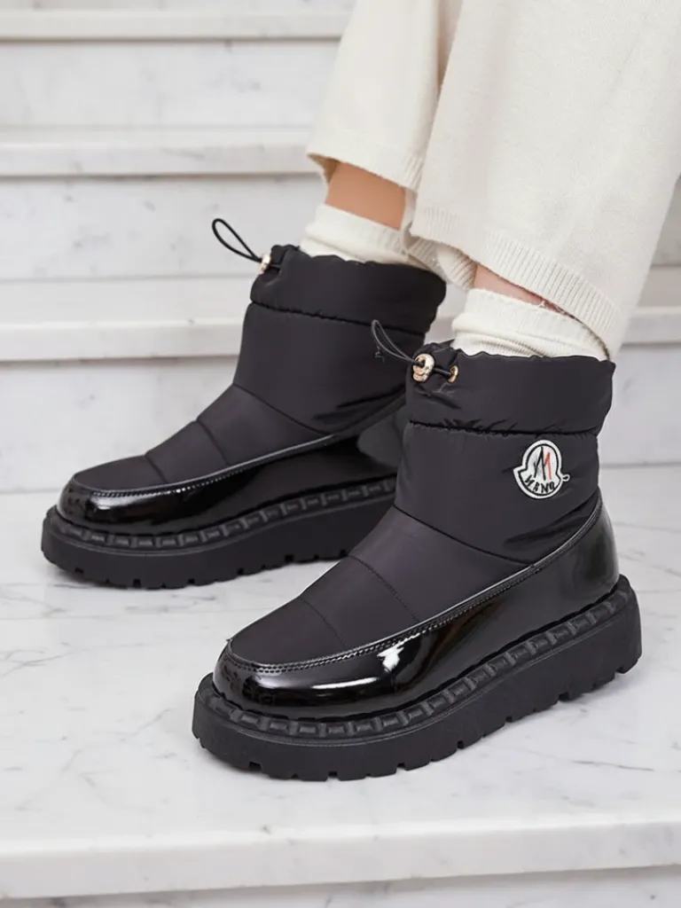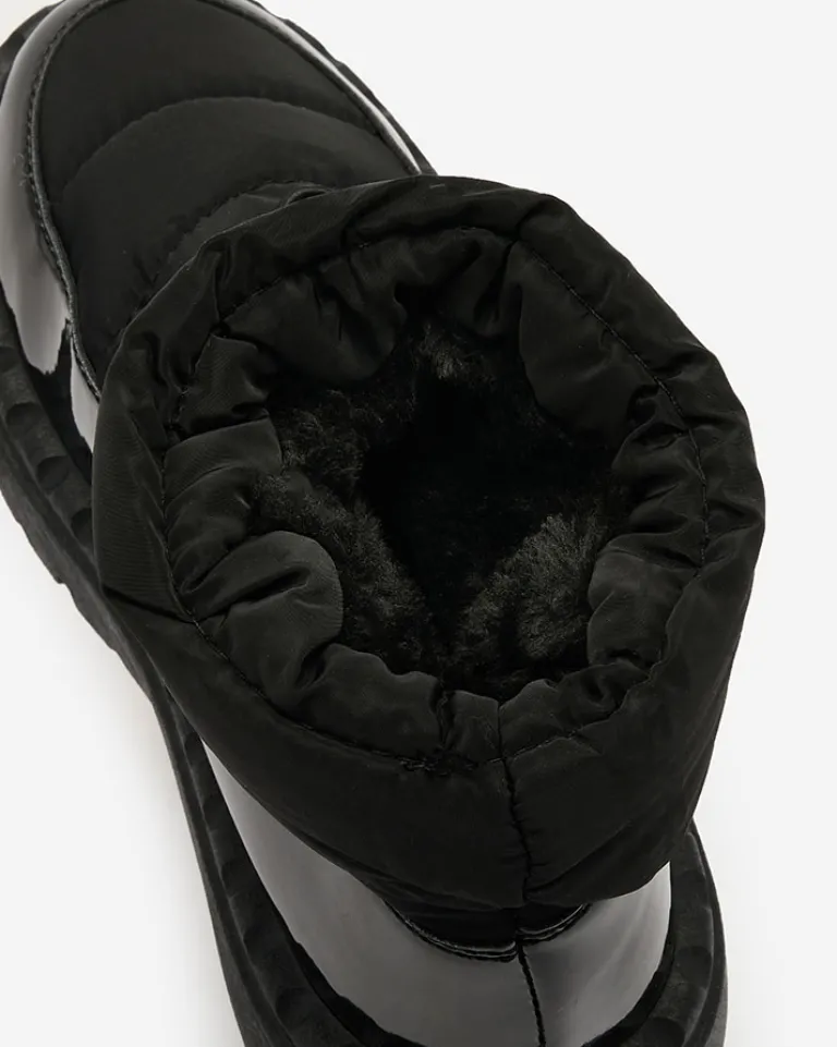 - Ponadczasowe damskie obuwie typu śniegowce z naszywką. Model cholewką wykonaną z materiału a’la cerata i wstawkami z lakierowanej eko-skóry. W środku ocieplenie w formie futerka, obuwie wsuwane i posiada ściągacz. Idealne na chłodniejszą porę roku!