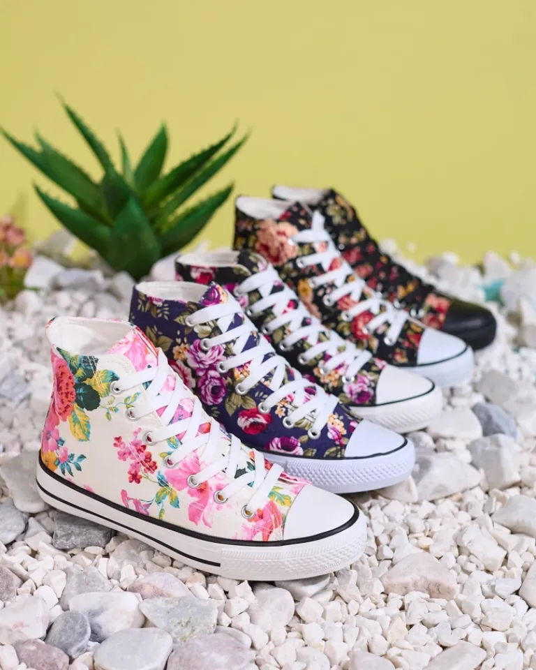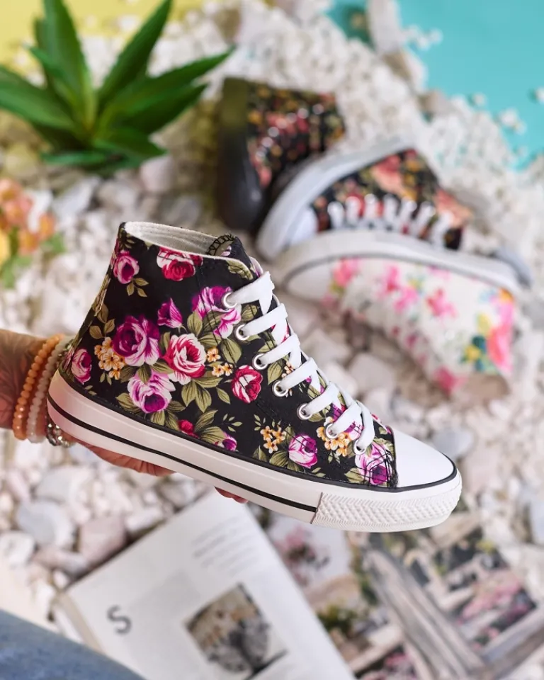 - Modne damskie wysokie trampki wykonane z tkaniny na gumowej podeszwie. Sznurowane i zdobione printem w kwiaty, dodające uroku. Wygodne i stylowe, idealne na casualowe stylizacje.