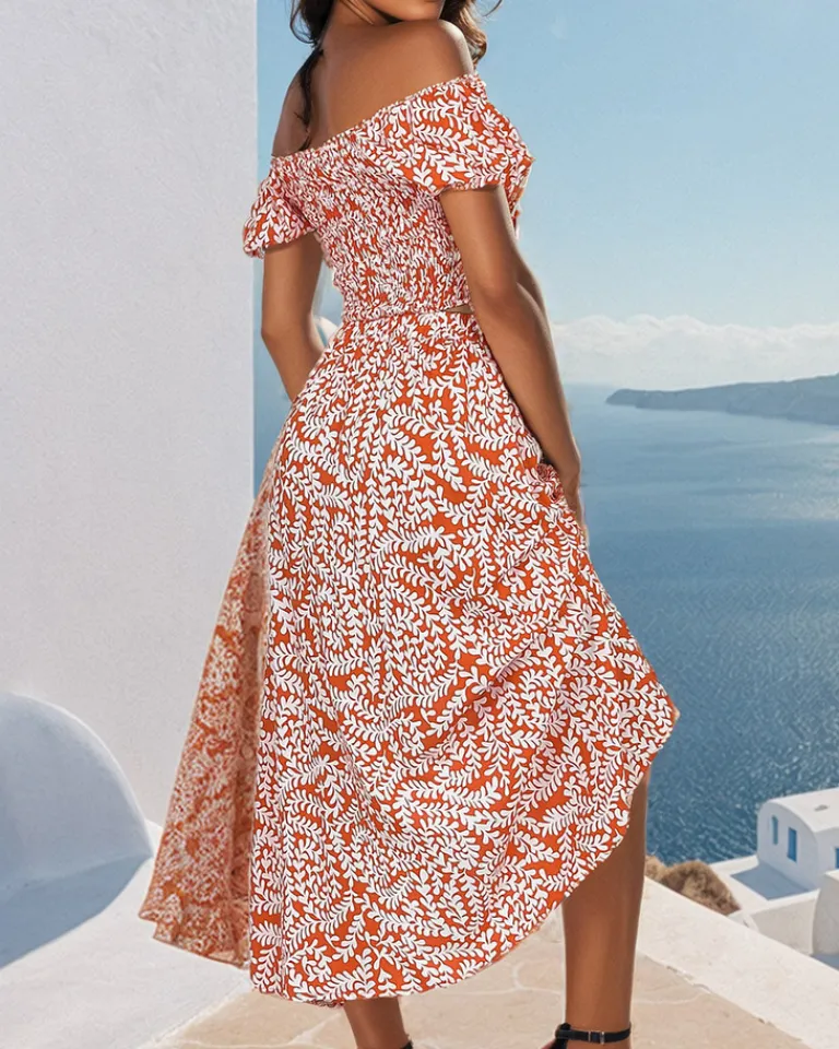 - Wyjątkowy damski komplet wykonany z przyjemnej tkaniny we wzór w kwiaty. Krótki top a’la hiszpanka z krótkimi rękawami. Długa spódnica wyposażona jest w gumę w talii. UWAGA: Dokładność pomiaru (+/-) 1 cm.
