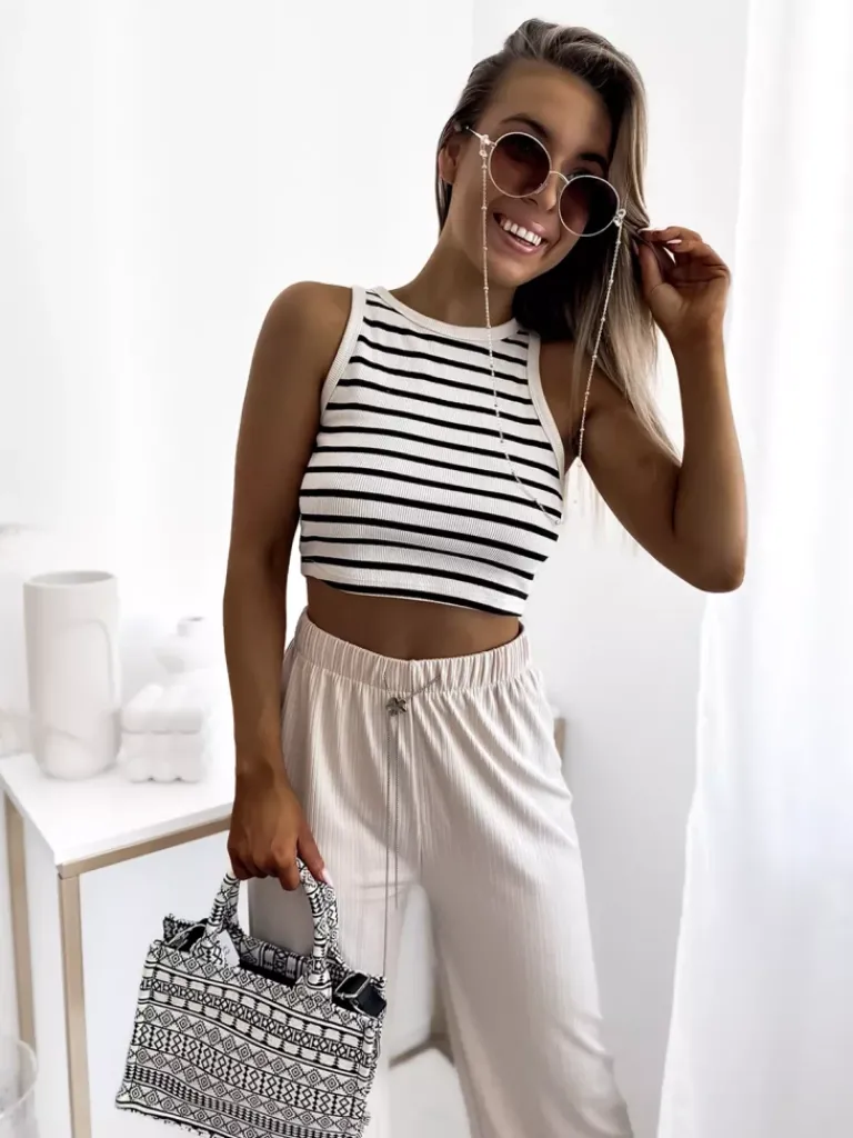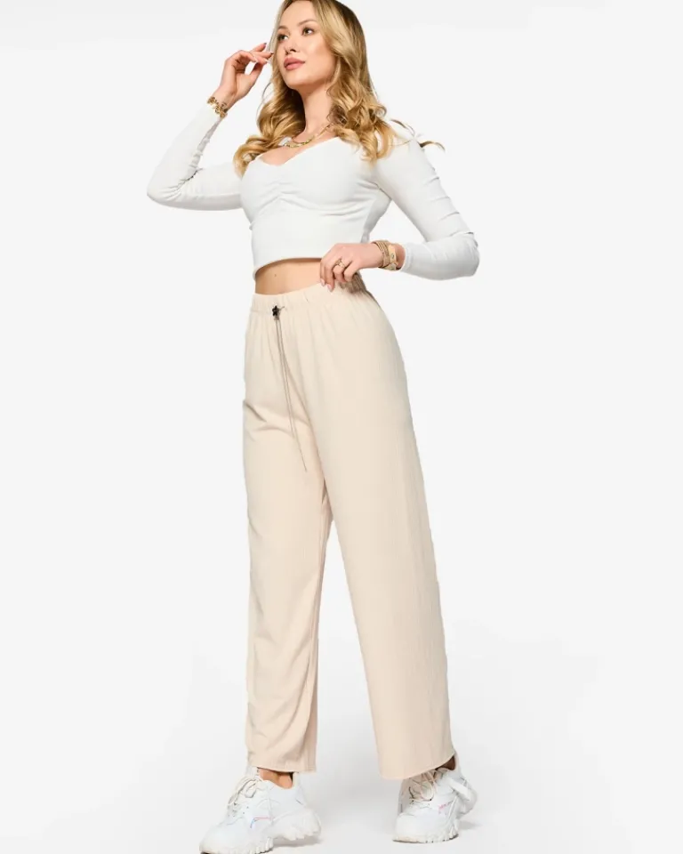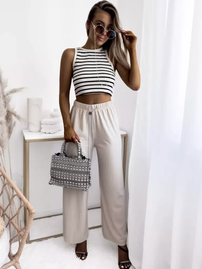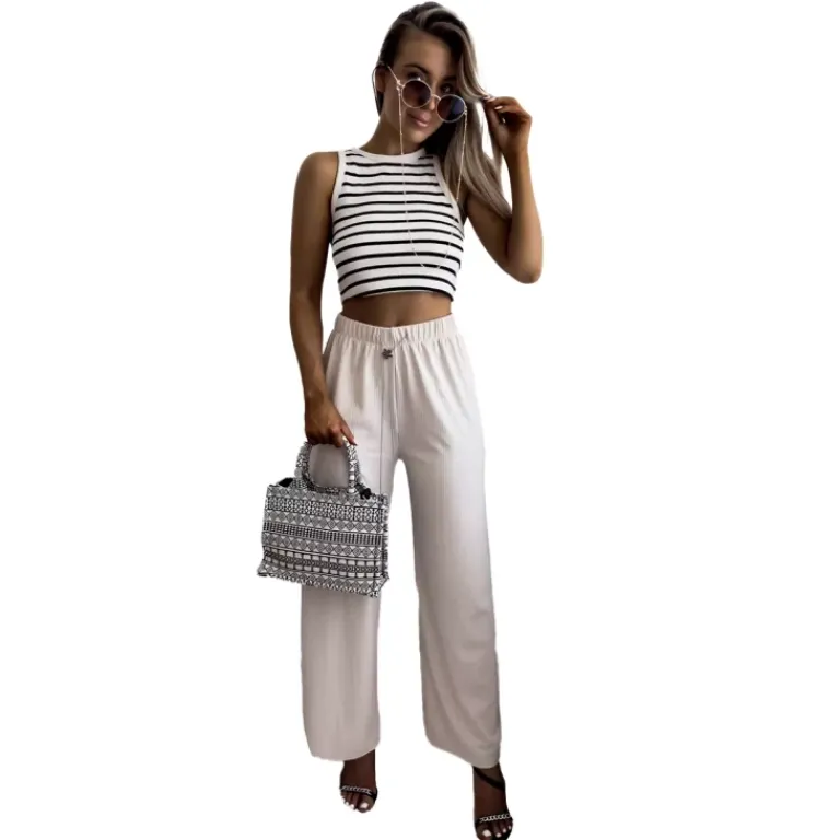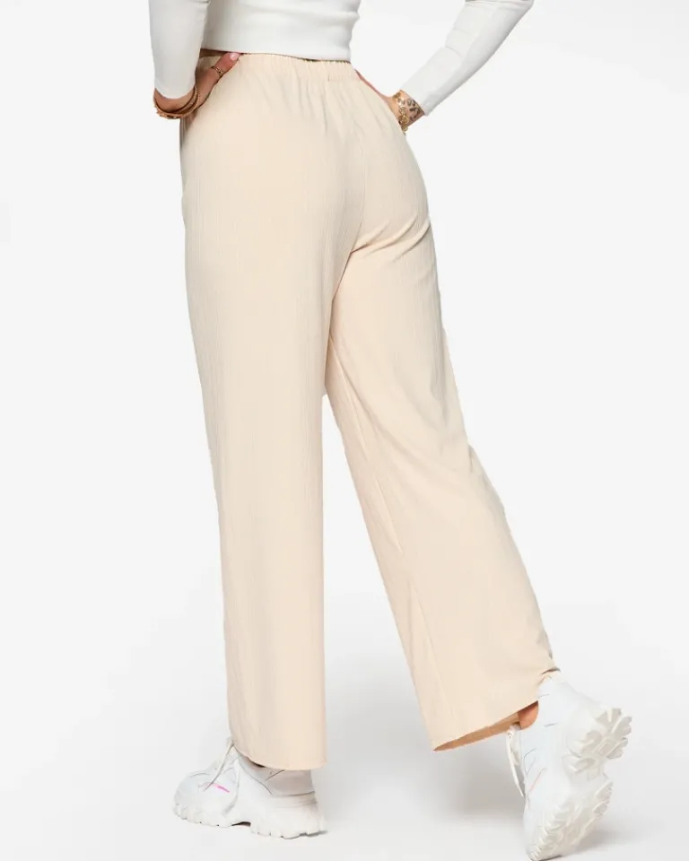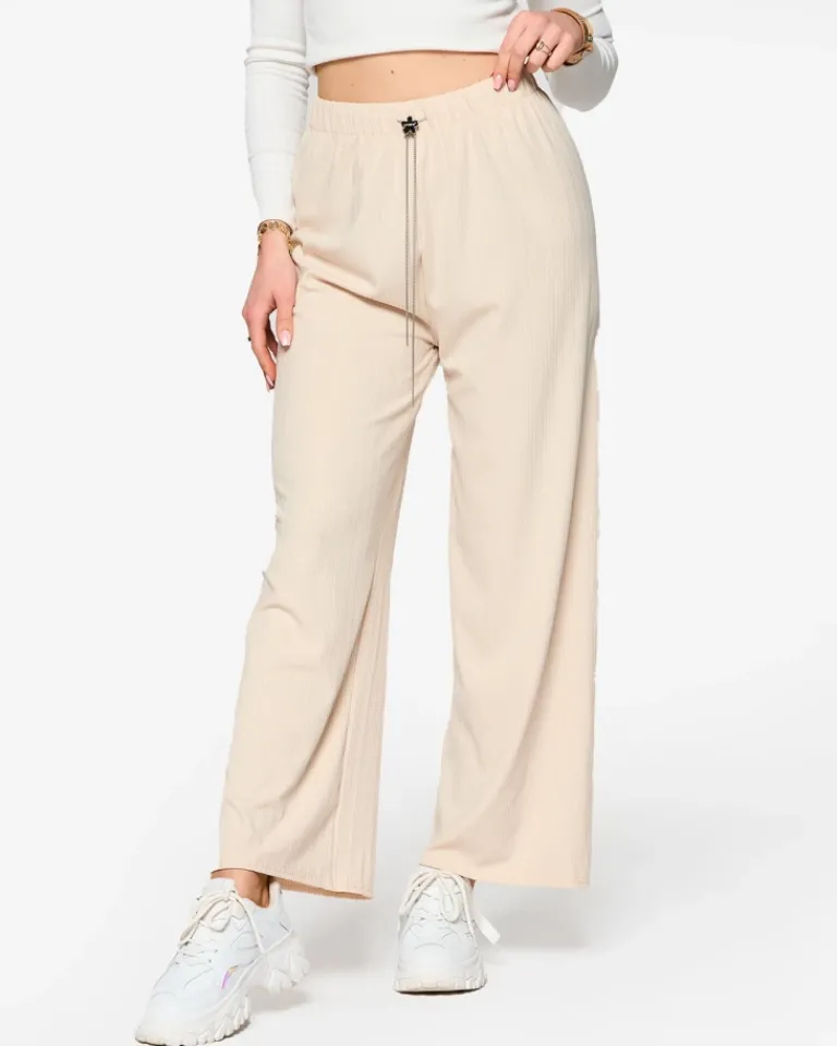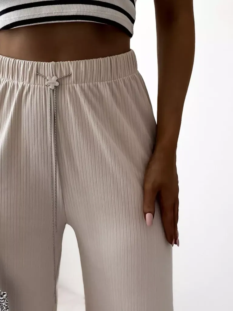 - Lekkie damskie szerokie spodnie, wykonane z prążkowanej tkaniny. Produkt posiada elastyczną gumę w pasie oraz troczki, które doskonale podkreślą talię. Must have tego sezonu! UWAGA: Dokładność pomiaru (+/-) 1 cm.