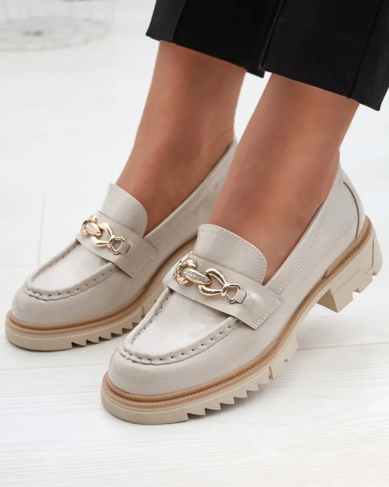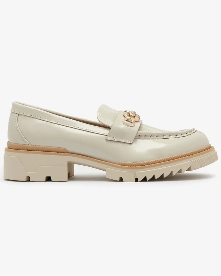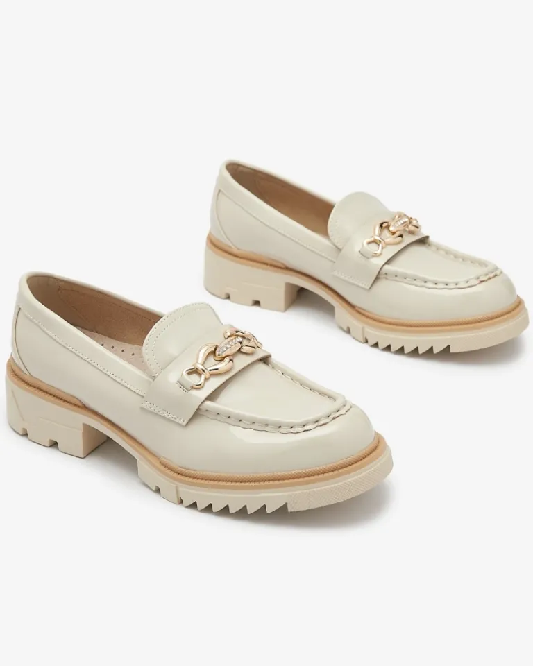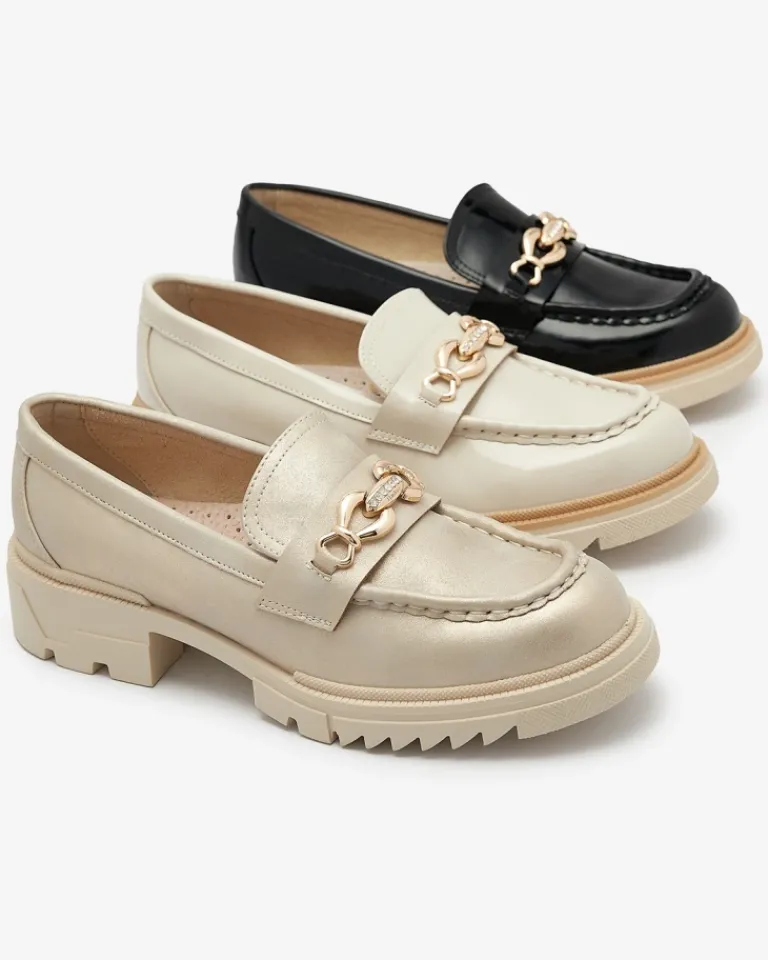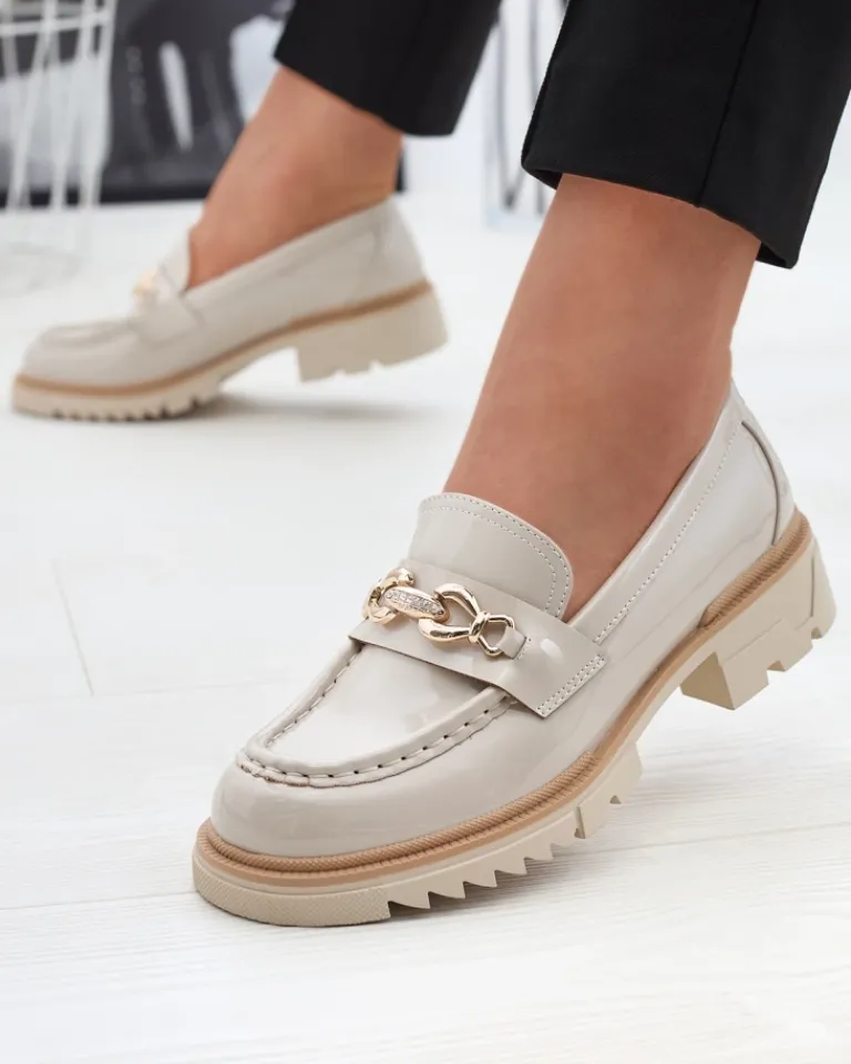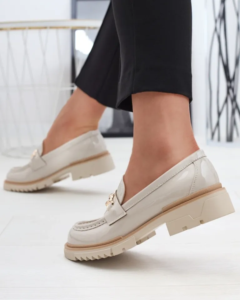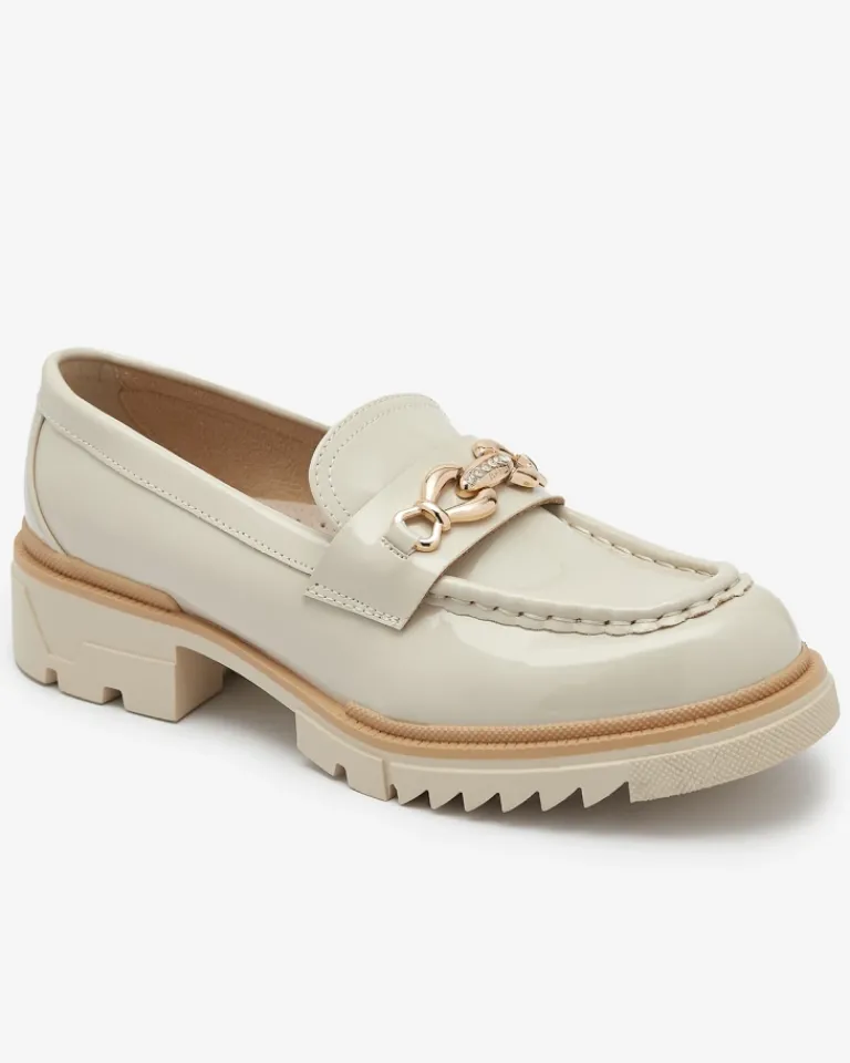 - Cudowne damskie mokasyny na masywnej podeszwie. Model w tylu casual i jest wykonany ze skóry ekologicznej lakierowanej, wkładka to skóra naturalna. Na nosku metalowa ozdoba w złotym kolorze. Będą świetną ozdobą do codziennych stylizacji.