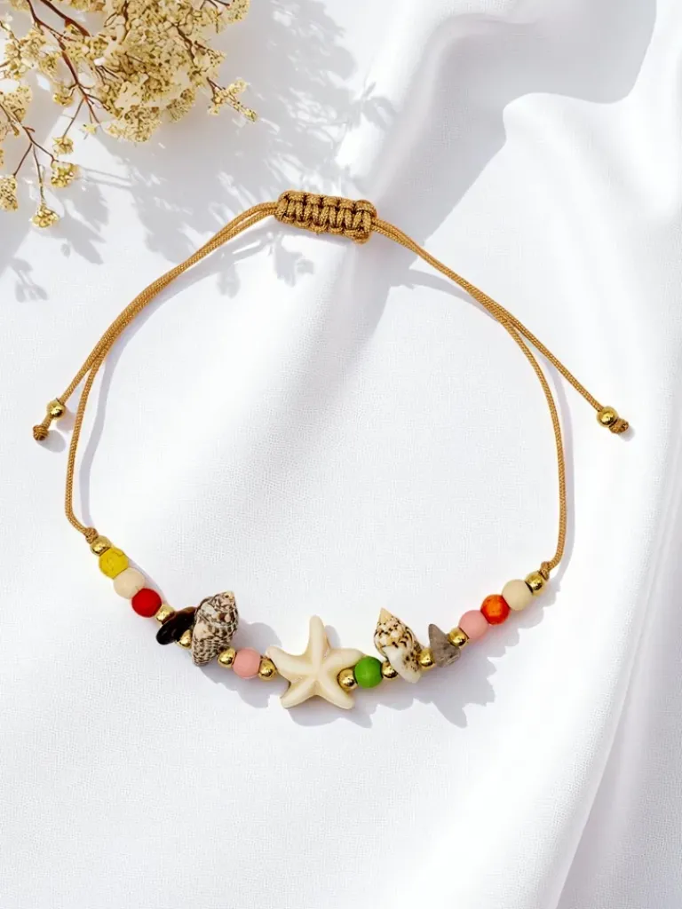 - Bransoletka na sznurku w morskim stylu, z regulacją, ozdobiona uroczą rozgwiazdą i muszelką. Idealna na letnie dni, wprowadza nadmorski klimat do każdej stylizacji. Lekka, elegancka i pełna letniego uroku – doskonała na plażę i wakacyjne przygody.