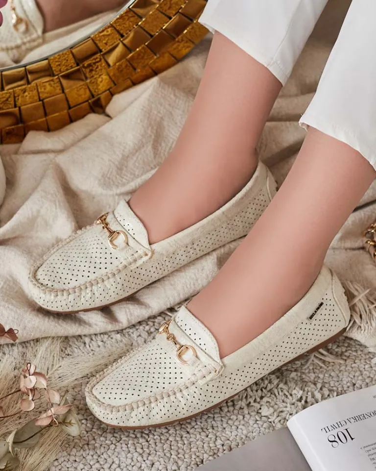 - Ażurowe damskie mokasyny na płaskiej podeszwie. Model jest wykonany ze skóry ekologicznej, posiada subtelną ozdobę na cholewce. W środku wkładka ze skóry naturalnej. Idealna baza na co dzień!