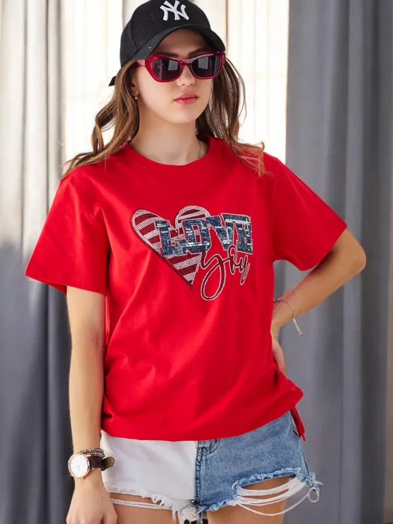 Clearance Bawełniany damski t-shirt LOVE z cyrkoniami Bluzki / Koszule / Koszulki