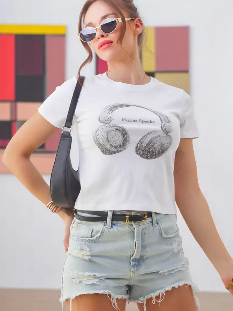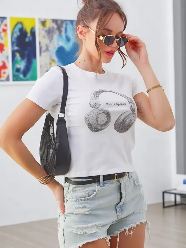 Clearance Bawełniany damski t-shirt z nadrukiem Music Speaking Bluzki / Koszule / Koszulki