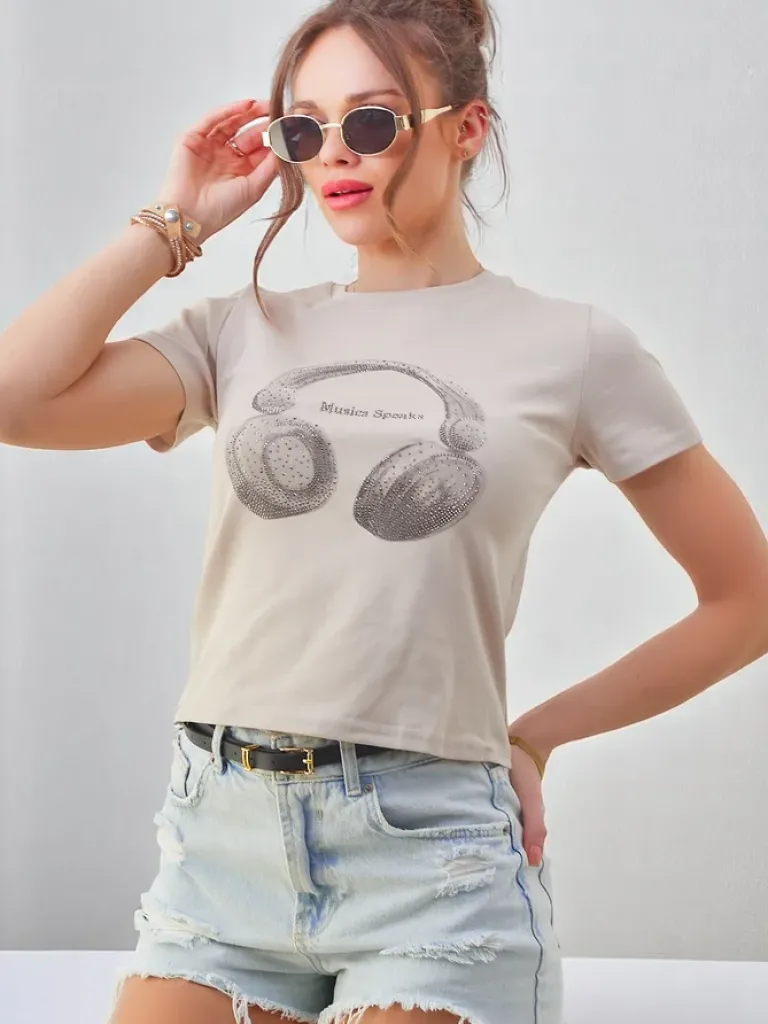 Clearance Bawełniany damski t-shirt z nadrukiem Music Speaking Bluzki / Koszule / Koszulki