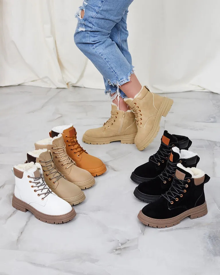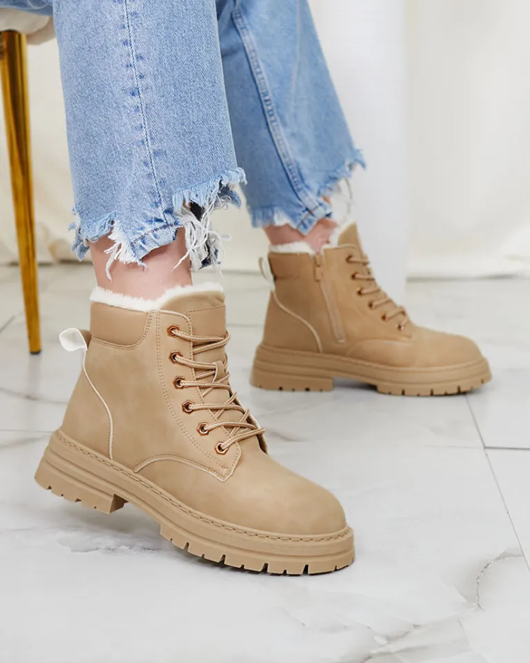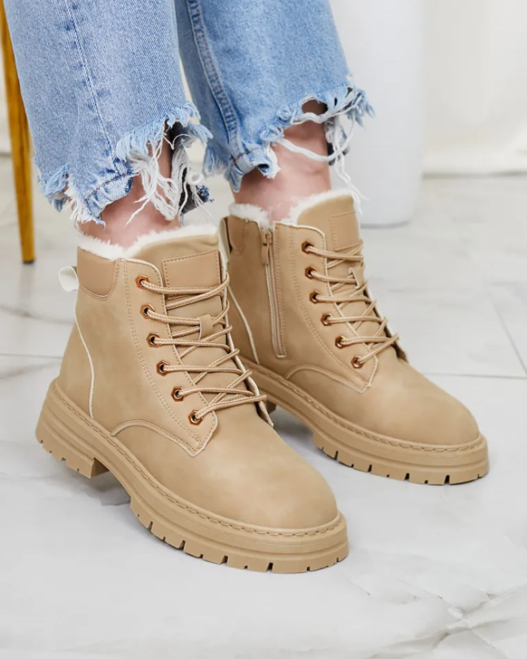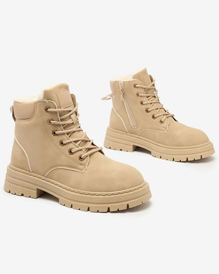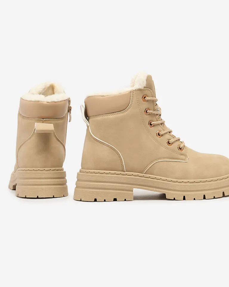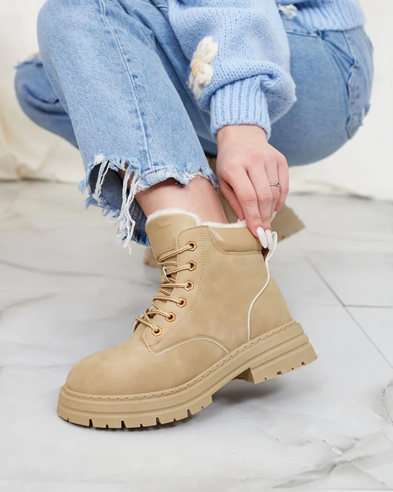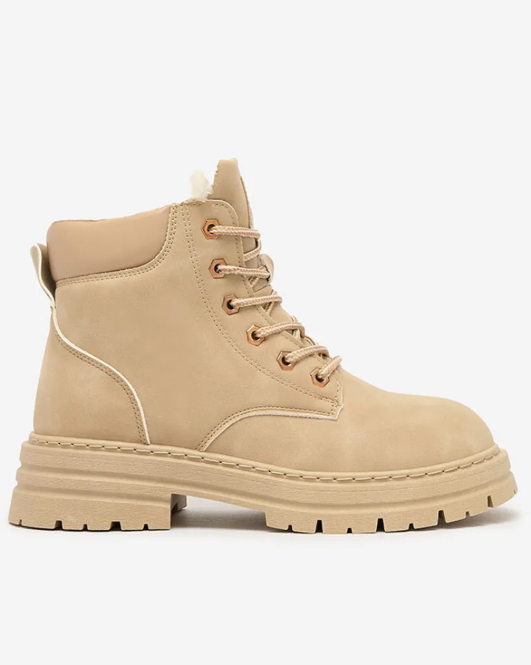- Ponadczasowe damskie botki a’la trapery. Sznurowana cholewka wykonana jest ze skóry ekologicznej matowej, środek ocieplony delikatnym futerkiem. Super dodatek do Twoich casualowych outfitów!