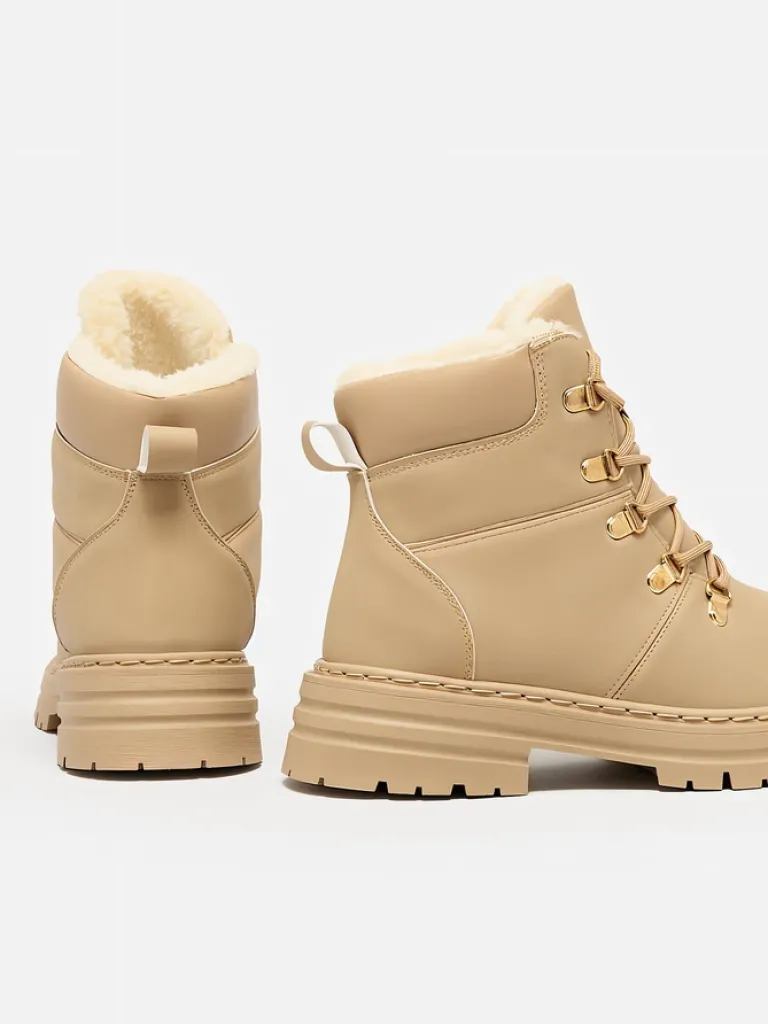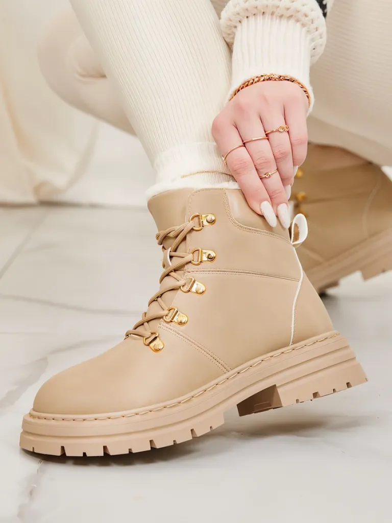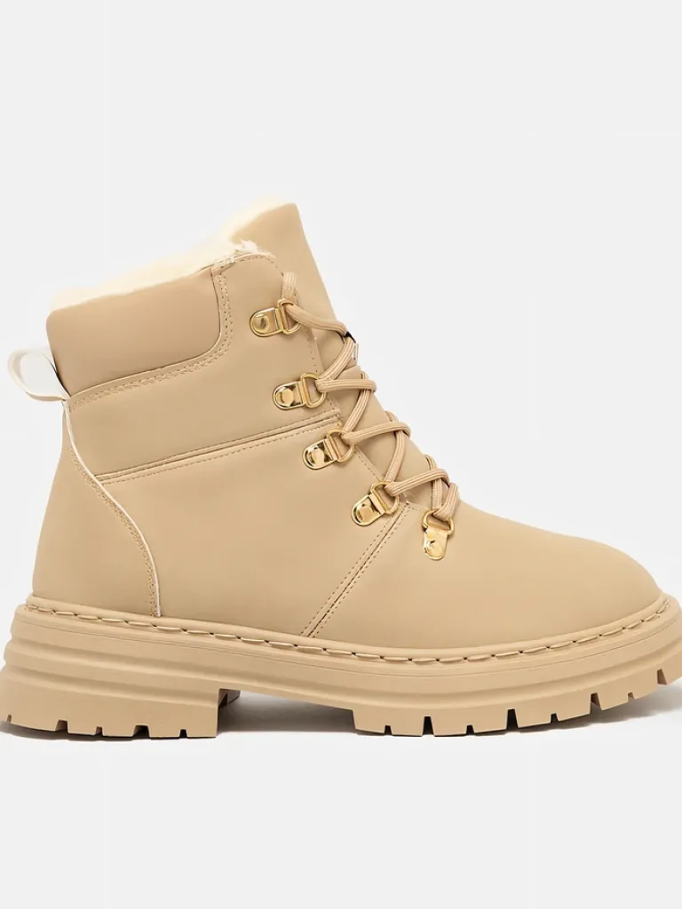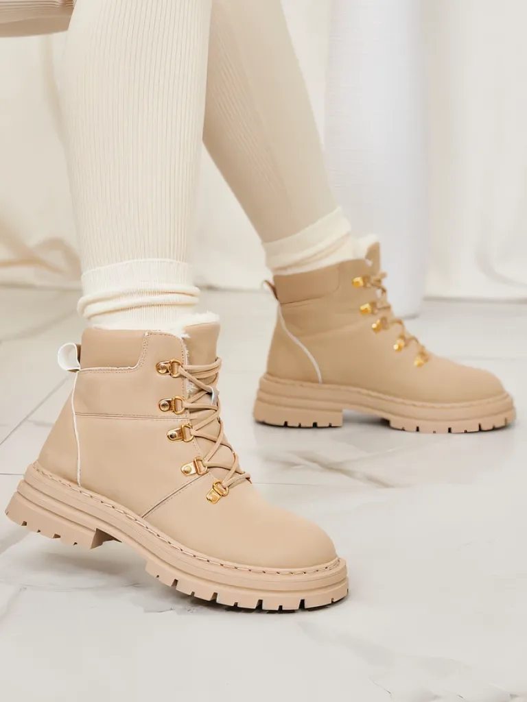 - Ocieplane trapery damskie, wykonane z eko skóry. Cholewka wiązana, w środku ocieplenie w formie futerka. Konkretne buty na złą pogodę!