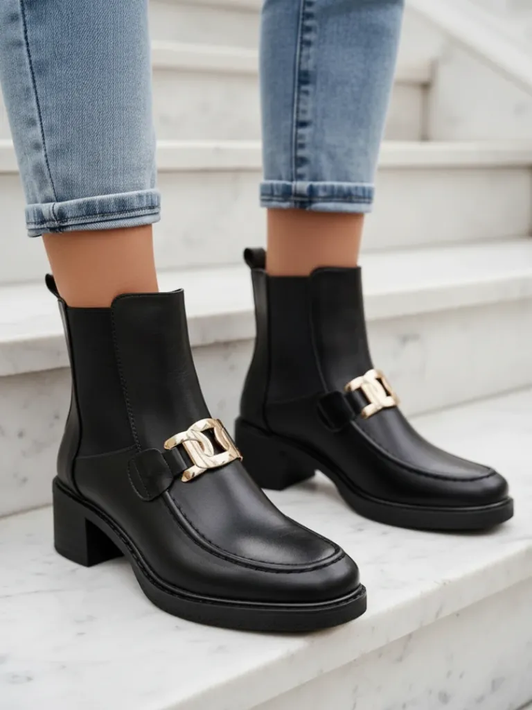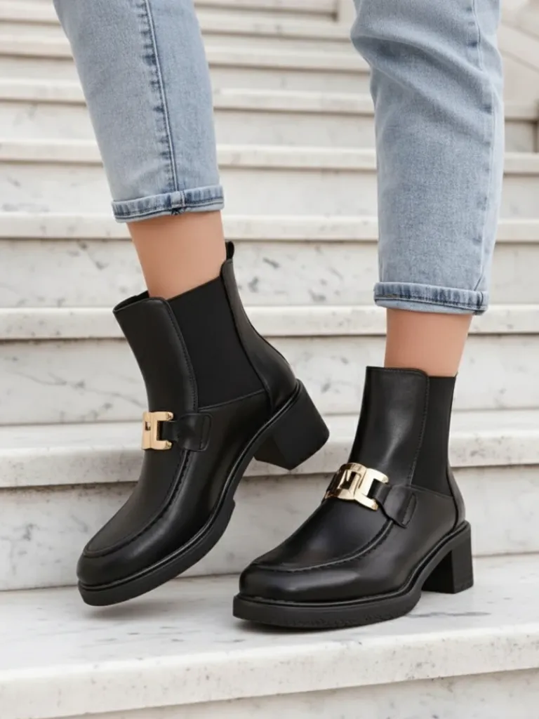 - Stylowe damskie botki na niskim słupku. Cholewka wykonana ze skóry ekologicznej. Środek wypełniony delikatnym futerkiem. Model posiada subtelną ozdobę na cholewce. Obuwie wsuwane, nosek okrągły. Świetny wybór na jesień!