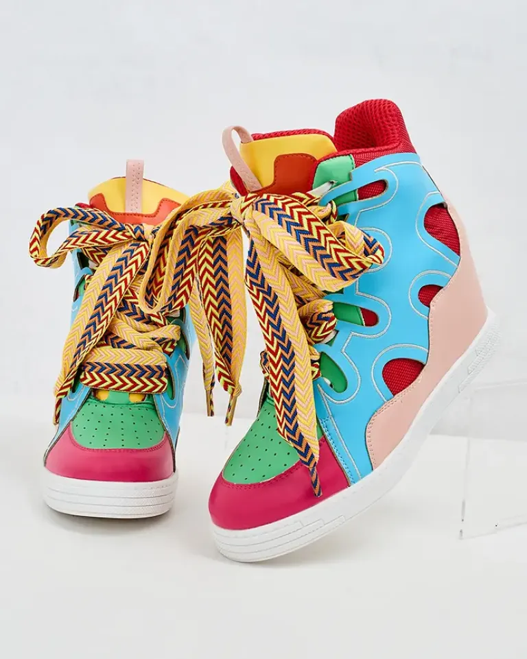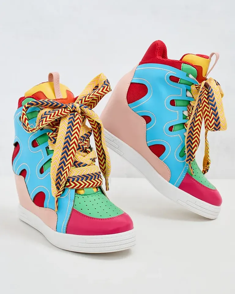 - Sportowe damskie botki na koturnie, wykonane z połączenia eko-skóry oraz eko-zamszu. Obuwie wiązane ozdobnymi sznurówkami, w środku eko skórzana wkładka.