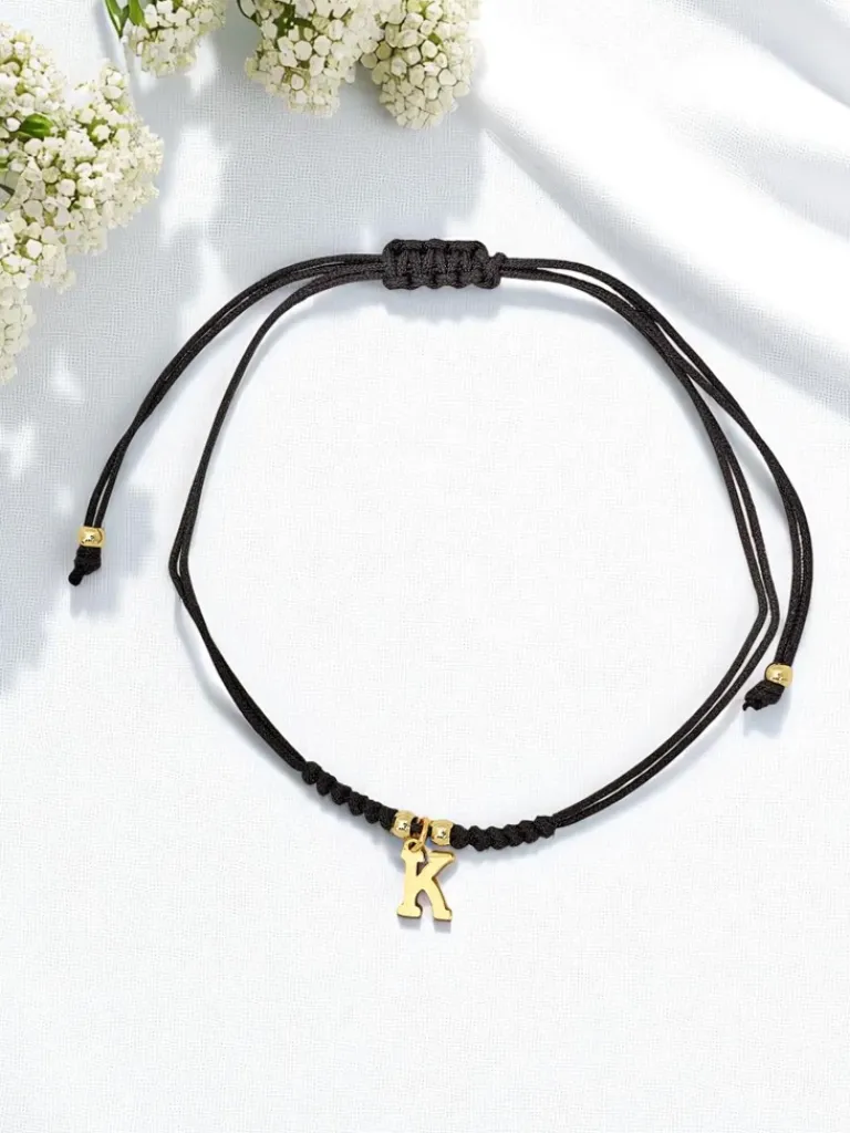 - Elegancka bransoletka na sznurku z regulacją, ozdobiona literką. Subtelna i personalizowana, doskonała na co dzień. Idealny wybór dla tych, którzy cenią unikalne akcenty w biżuterii, dodaje charakteru każdej stylizacji.