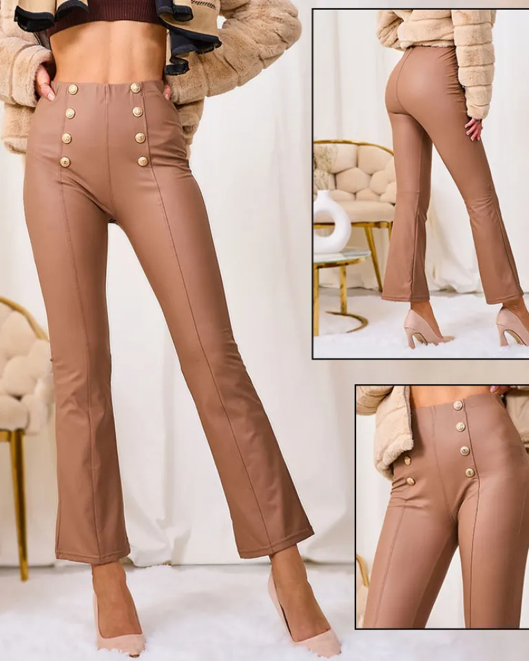 - Eko-skórzane legginsy a’la dzwony to połączenie stylu i komfortu. Model z gumą w pasie, doskonale dopasowuje się do figury, zapewniając wygodę i swobodę ruchów. Dodatkowo, ozdobione złotymi guzikami, te legginsy dodają stylizacji modnego charakteru.