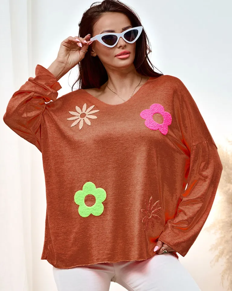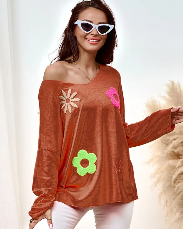 - Sweter damski z dekoltem w serek wykonany z przyjemnej tkaniny. Model posiada długie rękawy i naszywki w kształcie kwiatów. Idealna baza do zimowych outfitów!