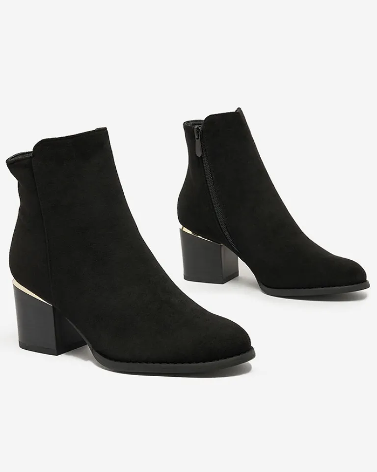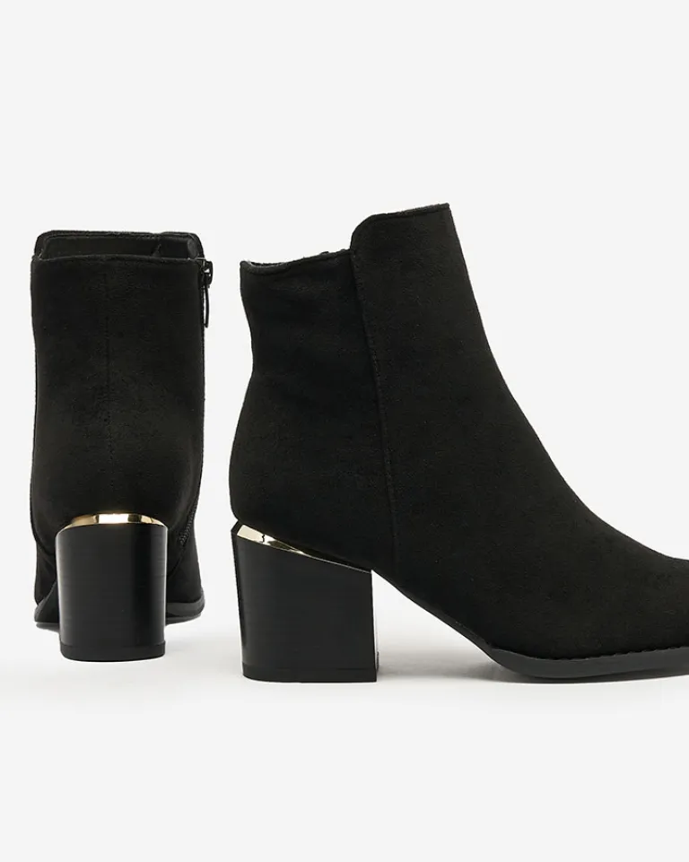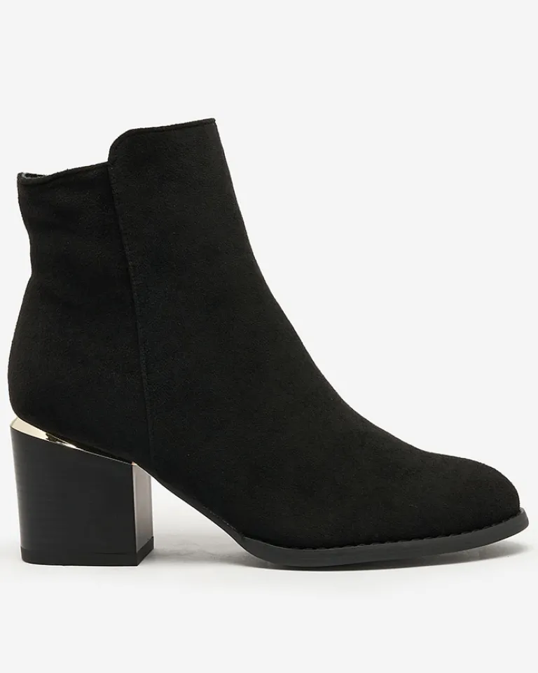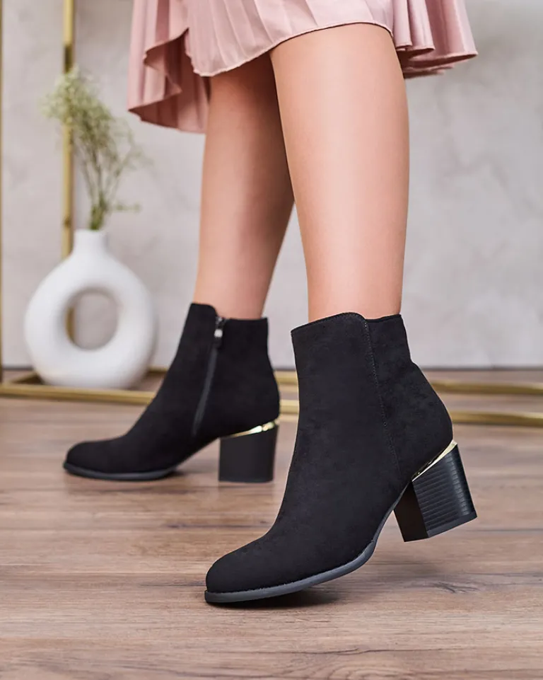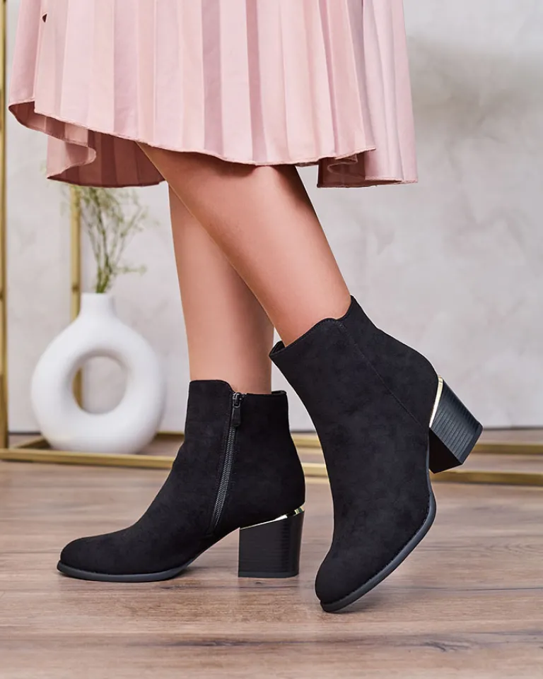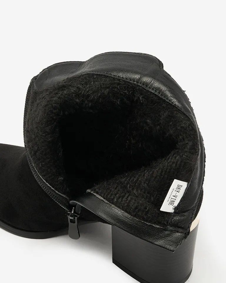 - Stylowe damskie botki na niskim słupku. Cholewka wykonana ze skóry ekologicznej zamszowej. Środek wypełniony delikatnym futerkiem. Zapięcie na zamek, nosek okrągły. Świetny wybór na jesień!