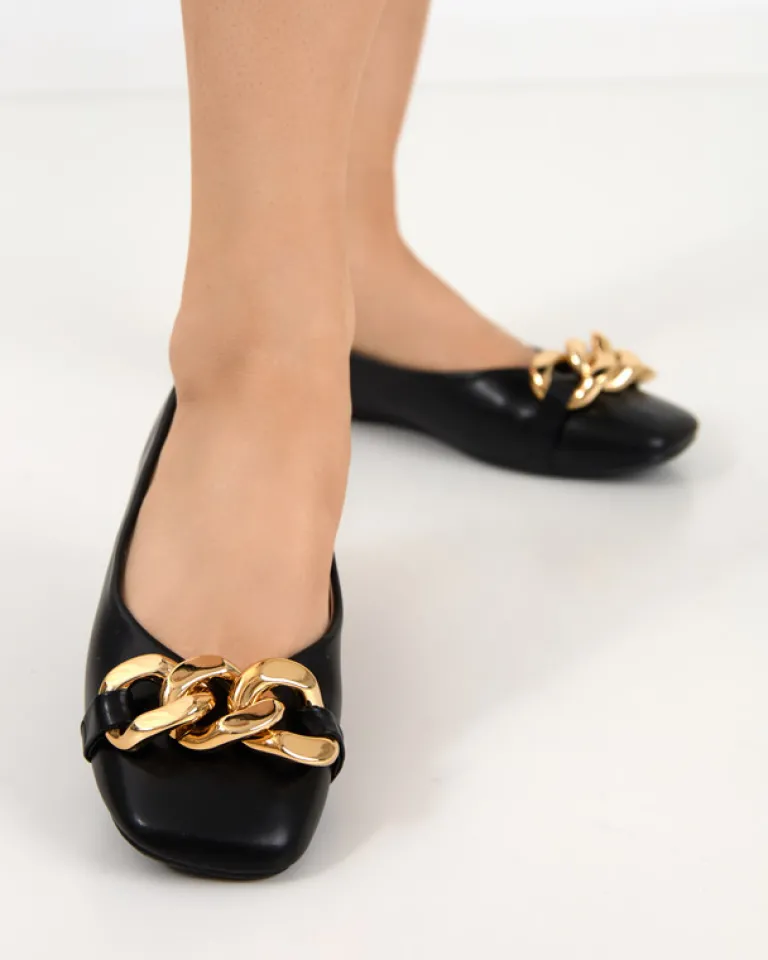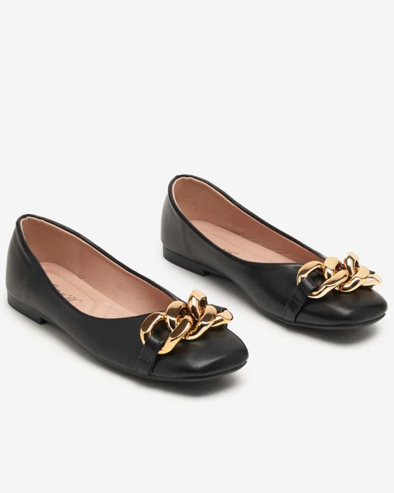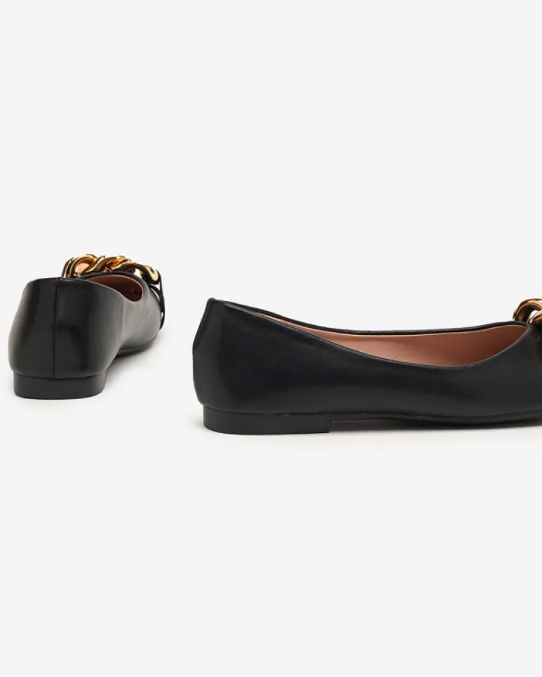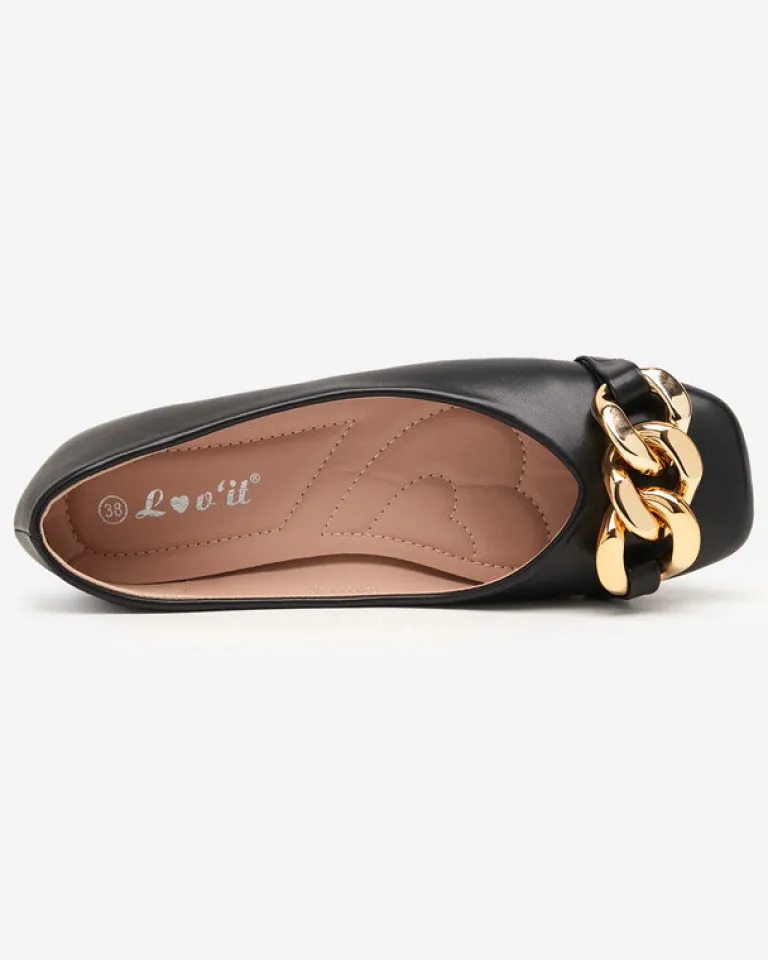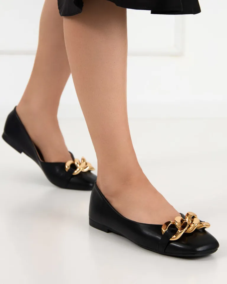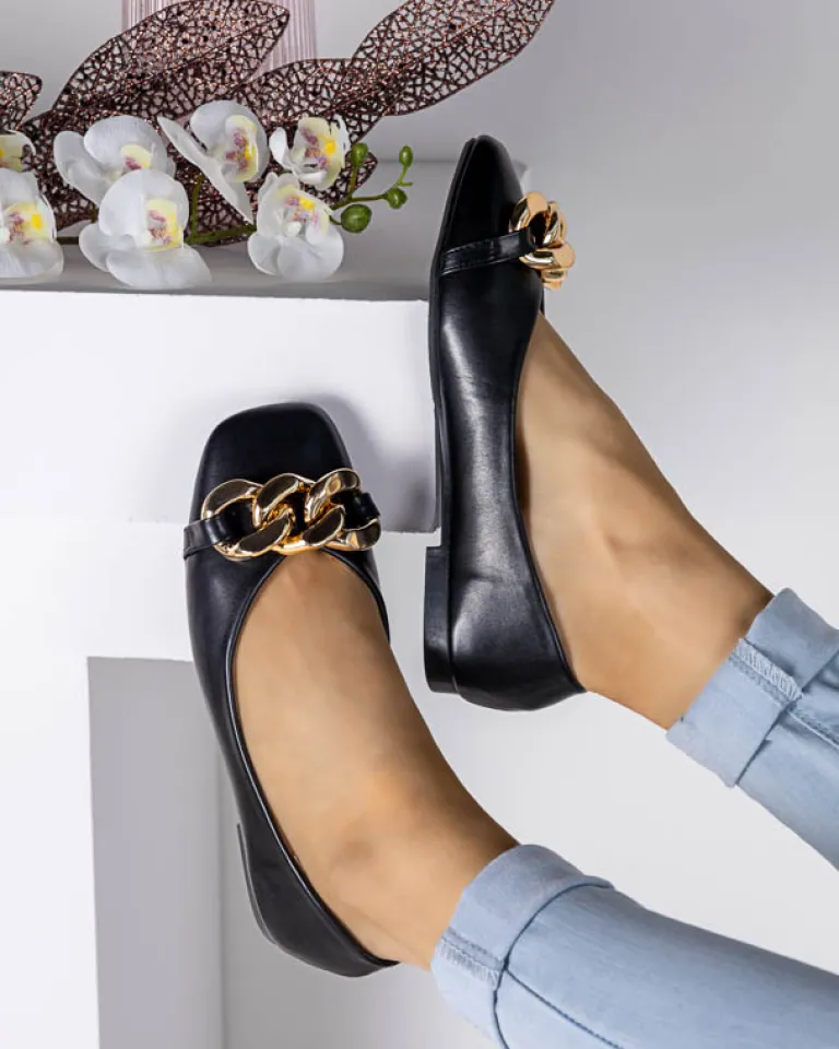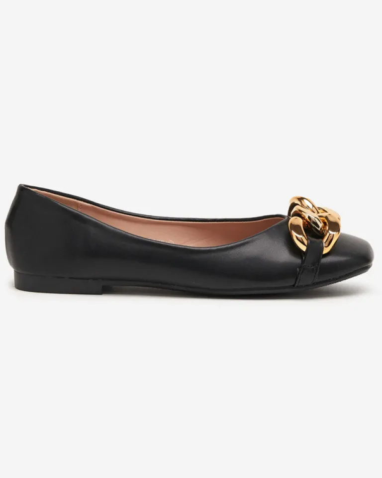 - Eleganckie damskie baleriny na płaskim obcasie, wykonane ze skóry ekologicznej. W środku miękka wkładka eko skórzana. Na kwadratowym nosku złota ozdoba.