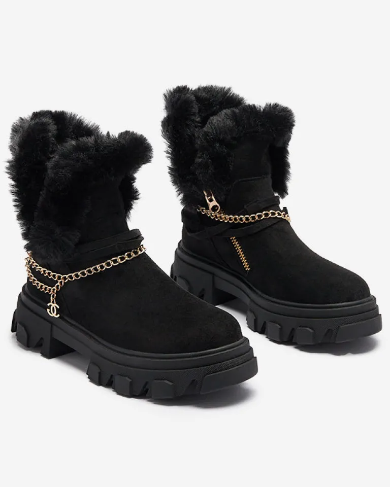 - Ponadczasowe damskie botki na płaskim obcasie, zdobione łańcuszkiem w złotym kolorze. Para jest wykonana ze skóry ekologicznej zamszowej, środek jest częściowo ocieplany delikatnym futerkiem. Po boku zapięcie suwakiem. CZARNE OCIEPLANE BOTKI VIDERIC