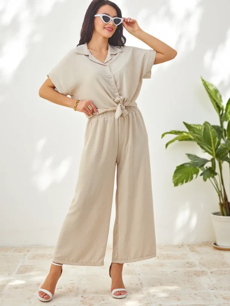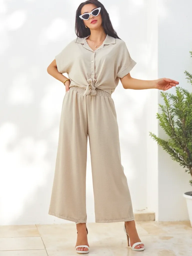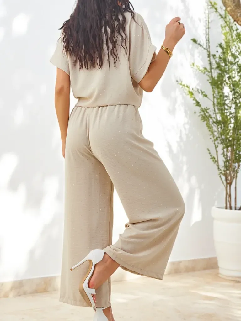 - Damski komplet casualowy wykonany z przyjemnej tkaniny. Rozpinana koszula z wiązaniem na dole, posiada krótkie rękawy. Szerokie spodnie z gumą w pasie. Całość zdobiona cyrkoniami!