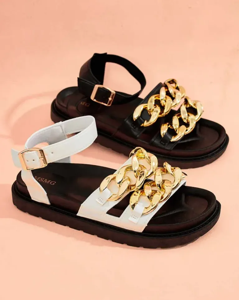 - Mega stylowe damskie sandałki na płaskiej podeszwie. Obuwie jest zapinane na sprzączkę i wykonane ze skóry ekologicznej. Na paseczku ozdoba. Super dodatek do Twoich casualowych outfitów!