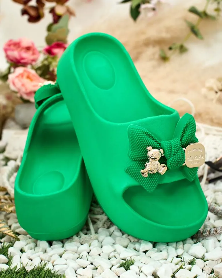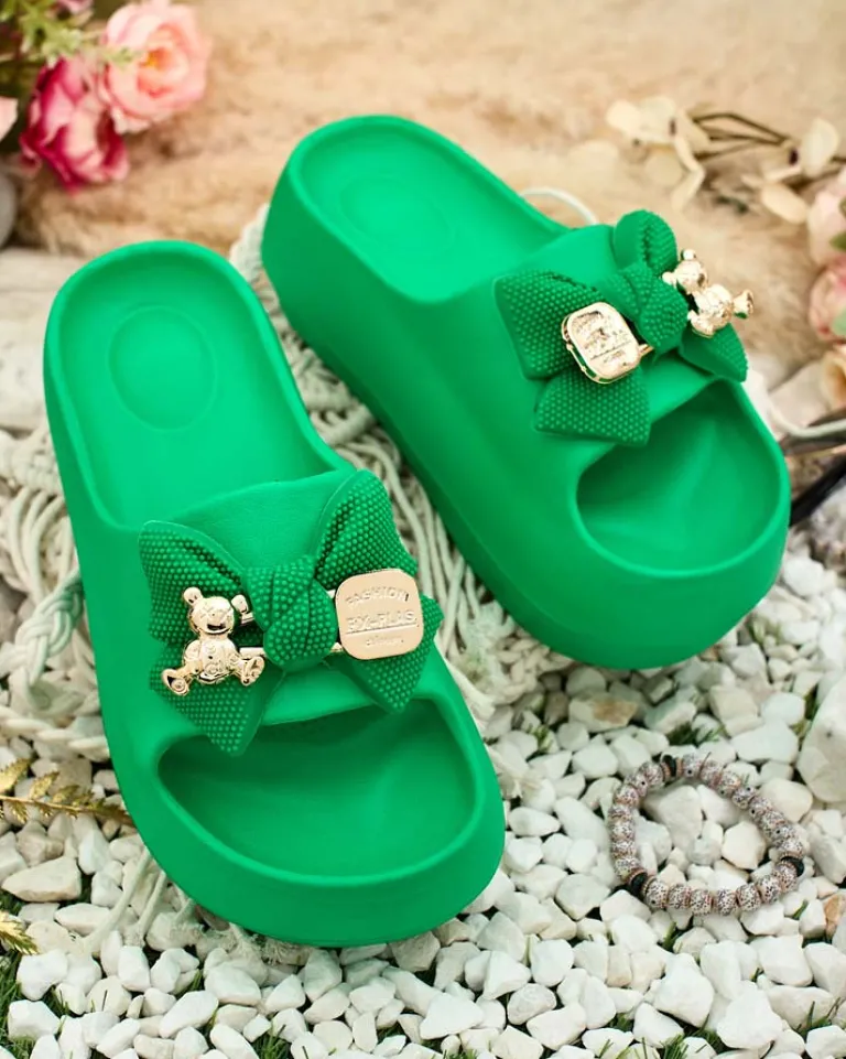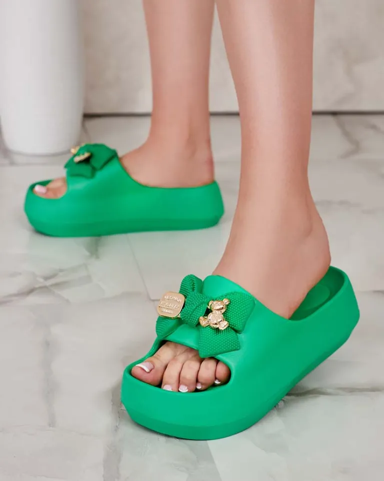 - Świetne damskie gumowe klapki na platformie. Posiadają na cholewce ozdobną kokardę. Idealny wybór na wakacje!