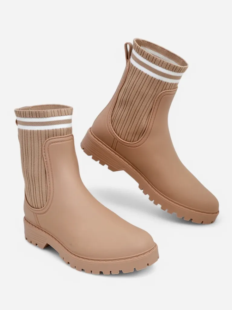 - Klasyczne damskie kalosze na płaskim obcasie, wykonane z materiału gumowego oraz wyższej, tkaninowej wstawki a 'la skarpetka. W środku wkładka z tkaniny. Idealne na wiosenne deszczowe dni!