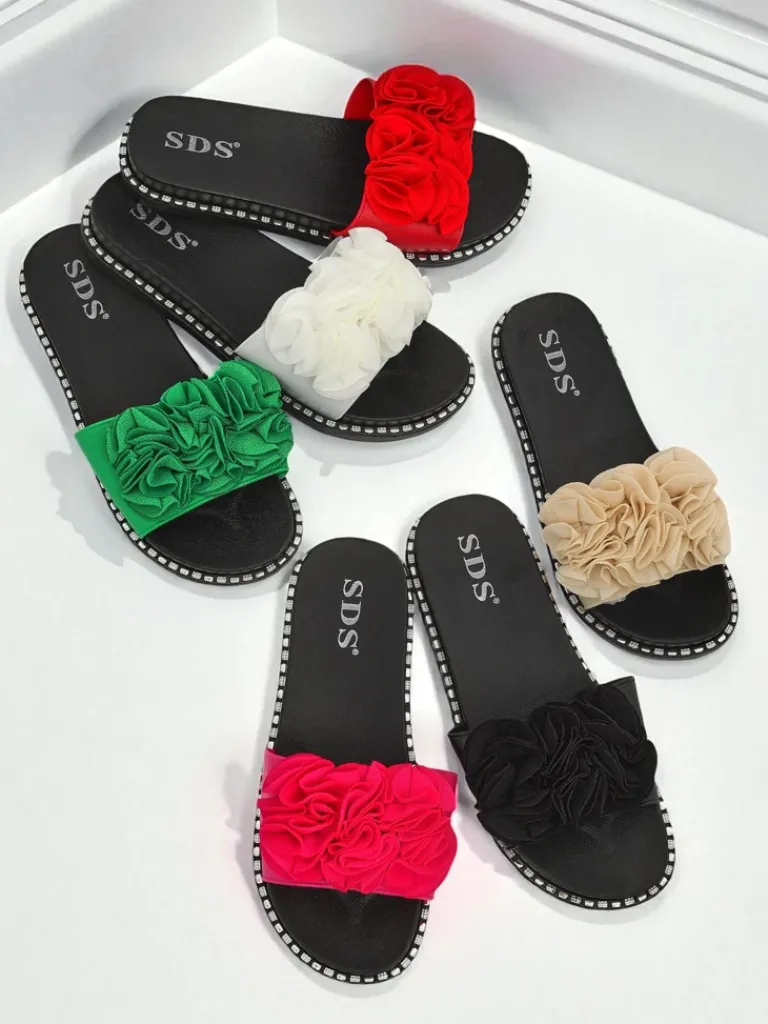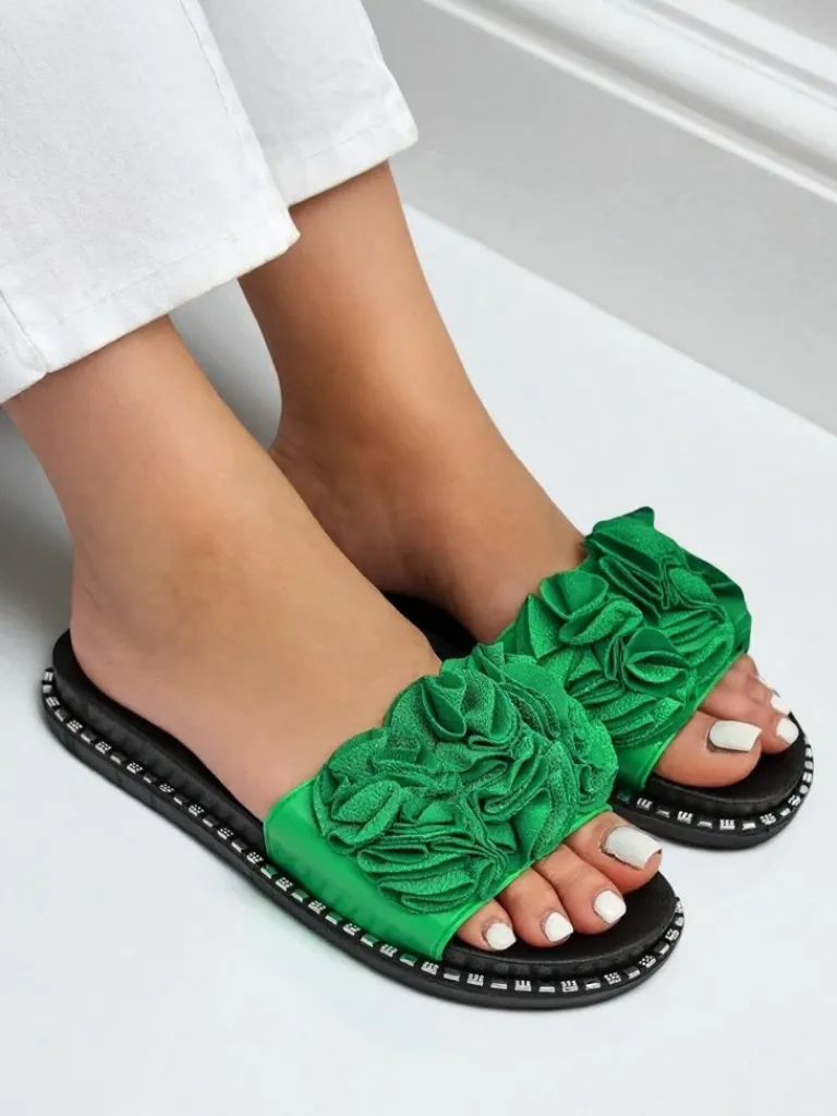 - Płaskie klapki damskie z eko skóry, z modnym, kwiatowym dodatkiem. Lekka, wygodna i stylowa propozycja na lato – ekologiczna elegancja na co dzień!