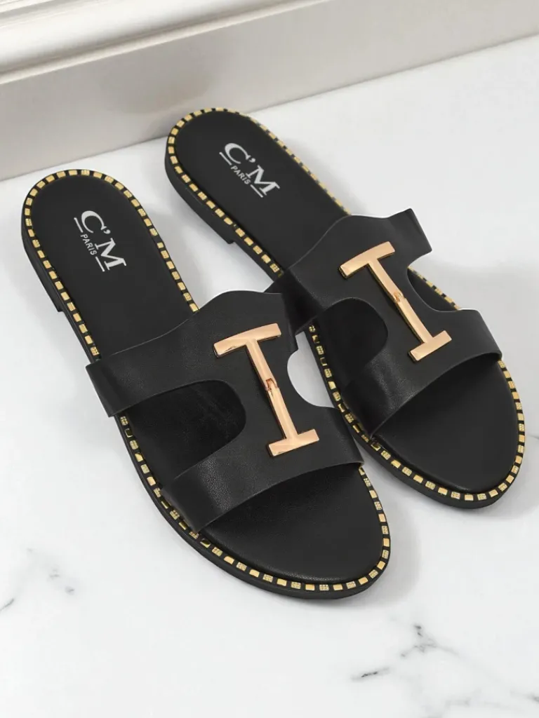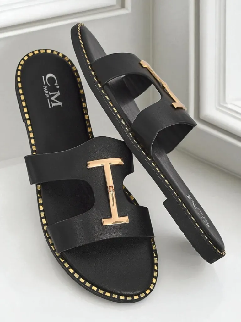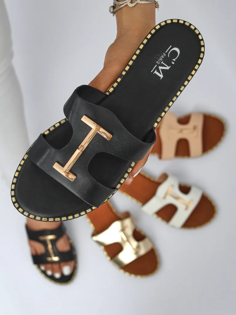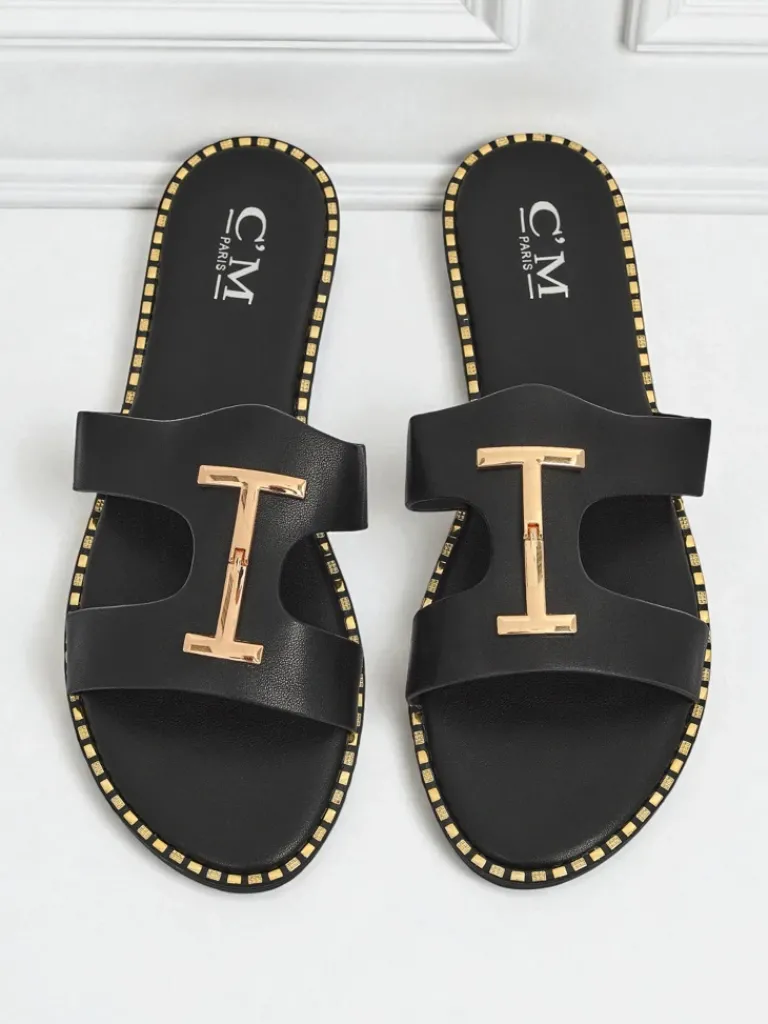 - Damskie klapki z eko skóry na płaskiej podeszwie z modnym pleceniem i złotą ozdobą. Stylowe i wygodne, idealne na lato. Lekka konstrukcja oraz elegancki akcent dodają szyku każdej codziennej stylizacji.