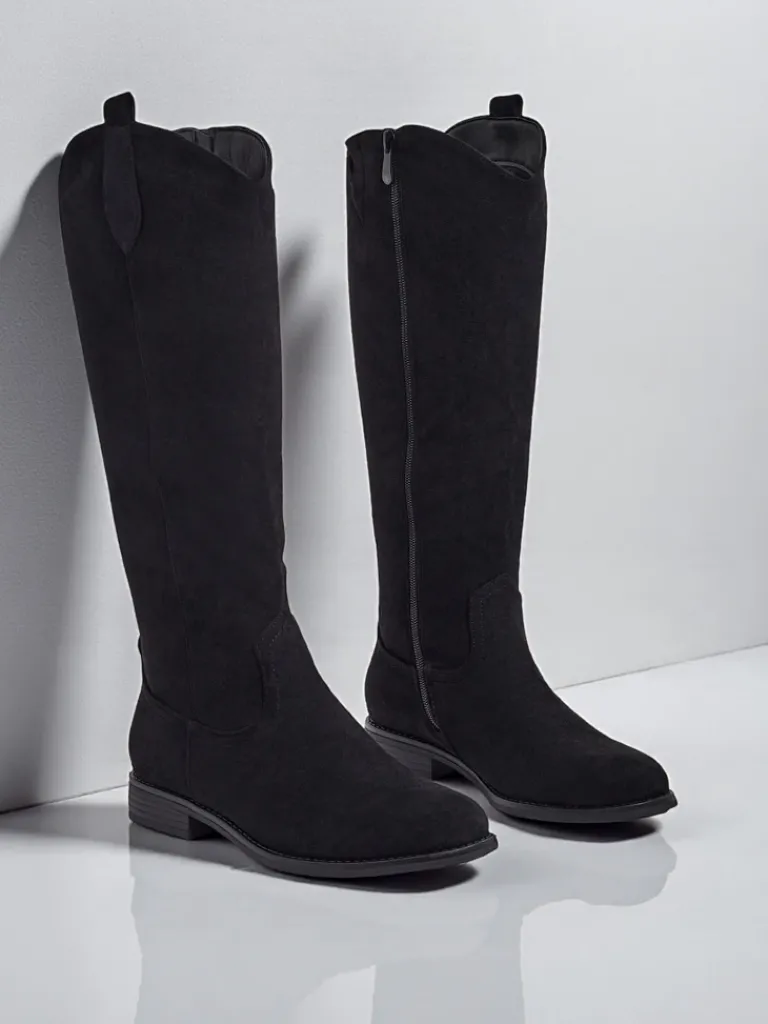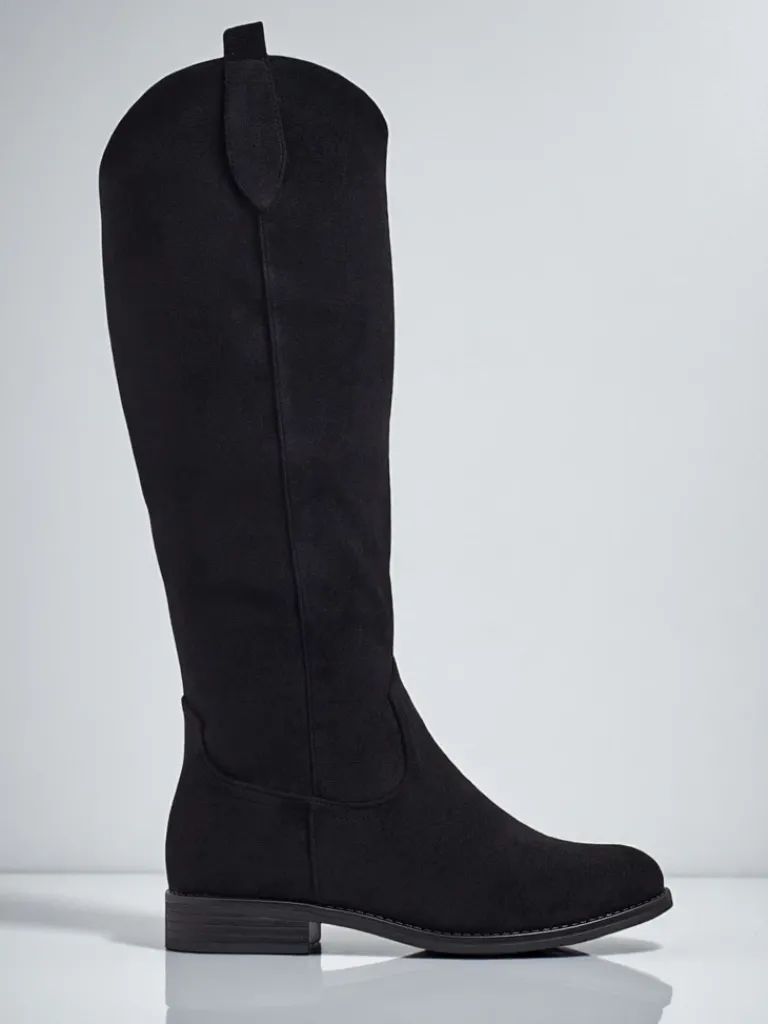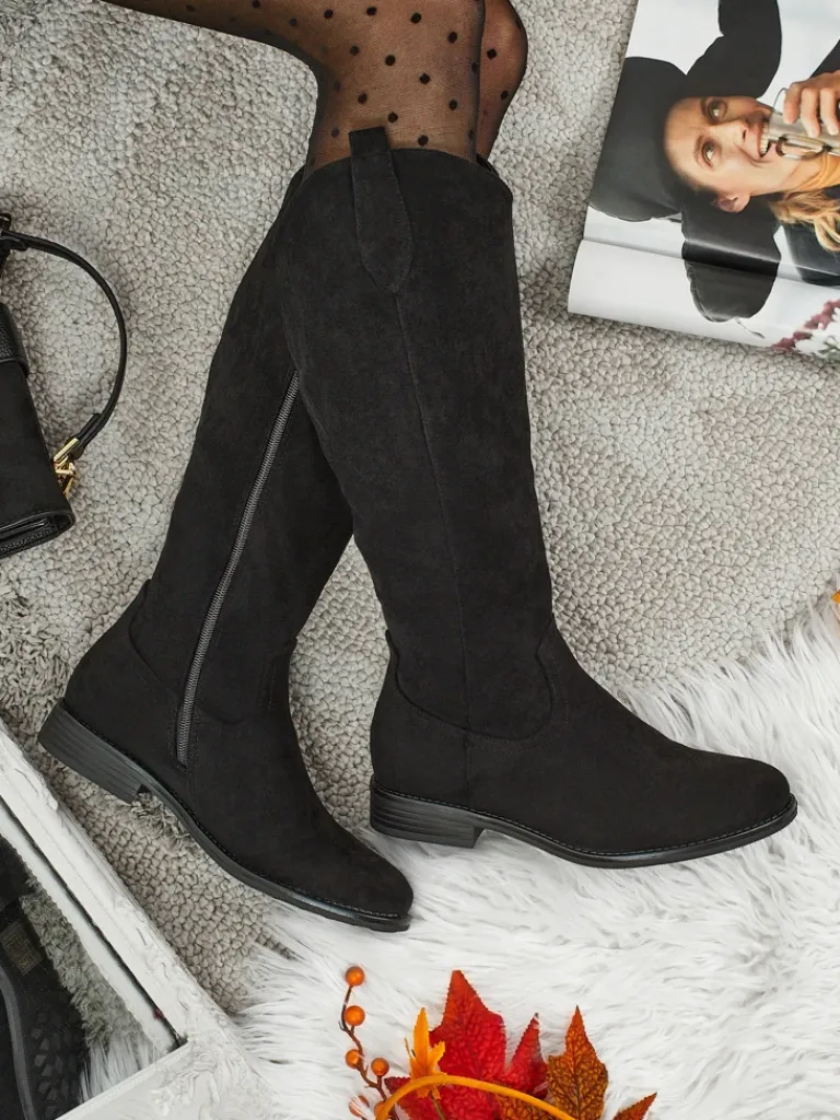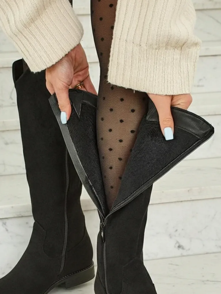 - Stylowe damskie kozaki do kolana na płaskiej podeszwie. Cholewka wykonana jest z eko skóry zamszowej, w środku ocieplenie w formie futerka. Model zapinany na suwak. Idealne do codziennych jesiennych outfitów!
