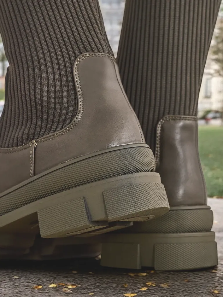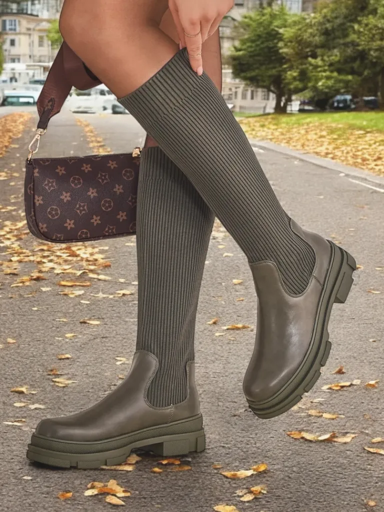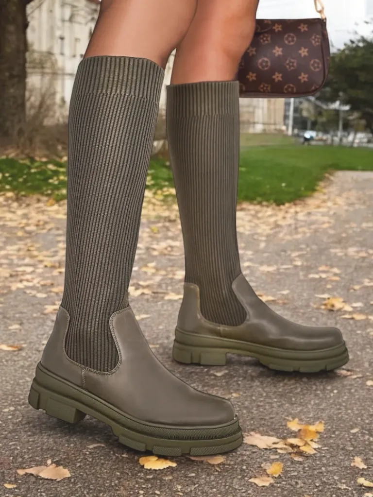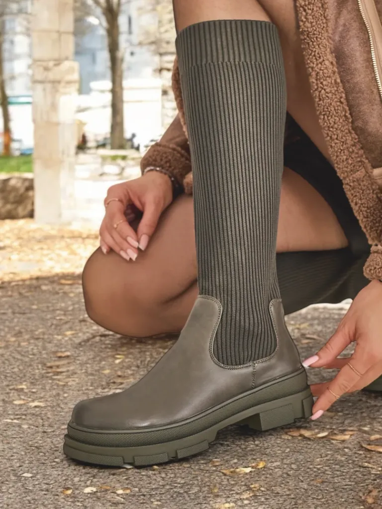 - Stylowe damskie kozaki do kolana na płaskim obcasie. Cholewka wykonana jest z elastycznego materiału tkaninowego ze wstawkami z eko skóry, w środku tkaninowa wkładka. Model wsuwany. Idealne do codziennych jesiennych outfitów!