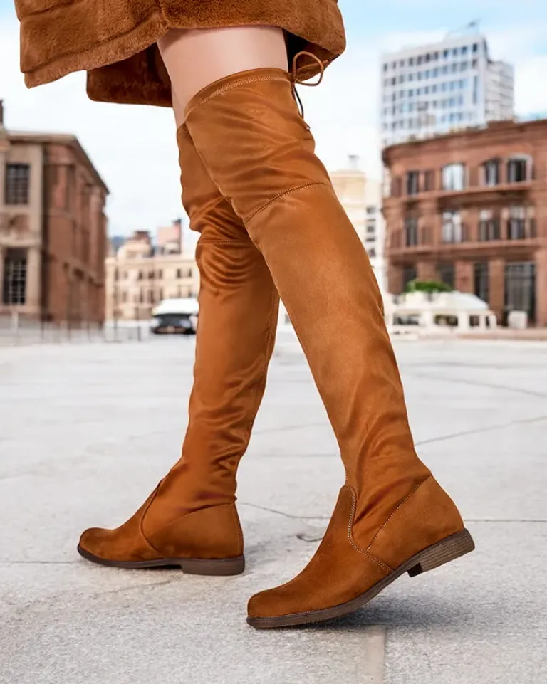 - Stylowe damskie kozaki za kolano na płaskiej podeszwie. Cholewka wykonana jest z eko zamszu, w środku eko skórzana wkładka. Model wsuwany, posiada ściągacz u góry cholewki. Idealne do codziennych jesiennych outfitów!