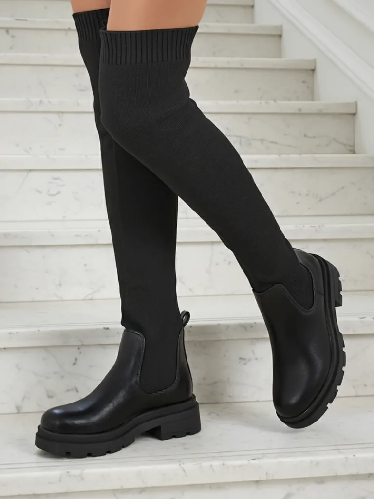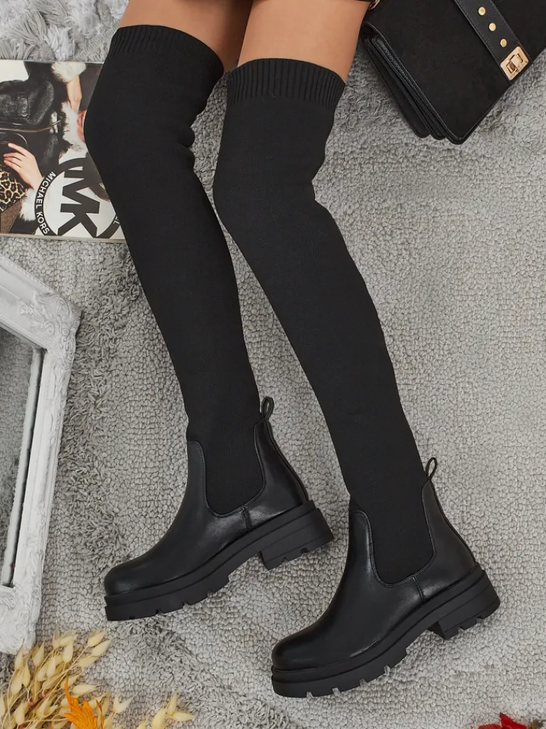 - Stylowe damskie kozaki za kolano na płaskim obcasie. Cholewka wykonana jest z elastycznego materiału tkaninowego ze wstawkami z eko skóry, w środku tkaninowa wkładka. Model wsuwany. Idealne do codziennych jesiennych outfitów!