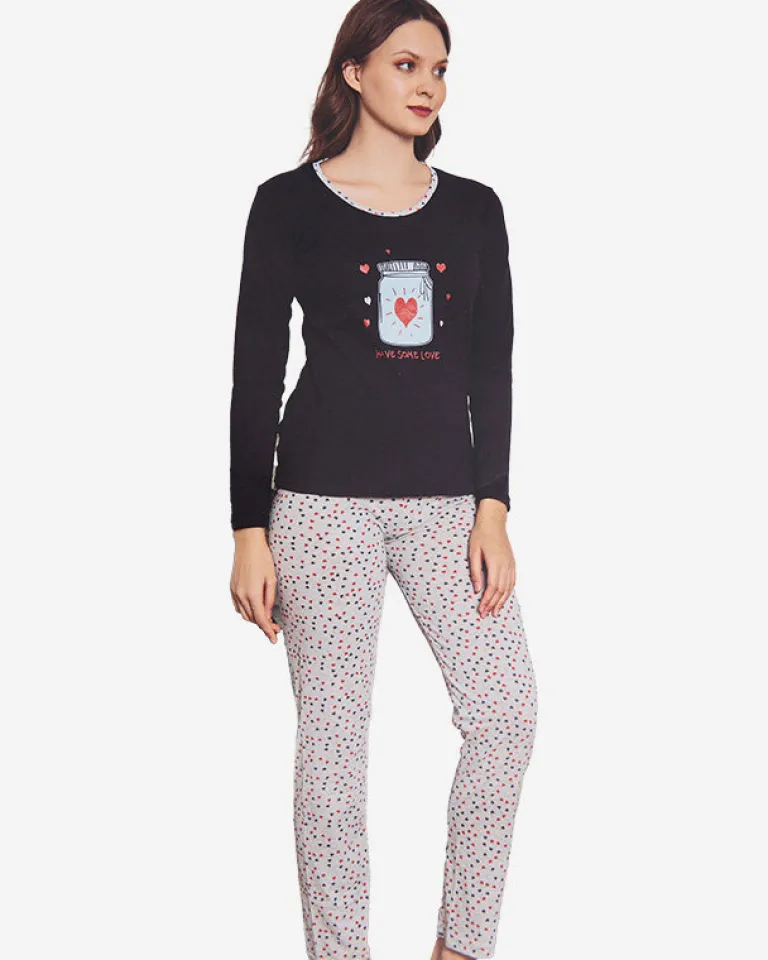 - Przepiękna damska 2-częściowa piżama wykonana z tkaniny bawełnianej wykończonej printem i wzorkami. Komplet posiada t-shirt typu longsleeve z długimi rękawami oraz spodnie z gumą w pasie i prostymi nogawkami. UWAGA: Dokładność pomiaru (+/-) 1 cm.