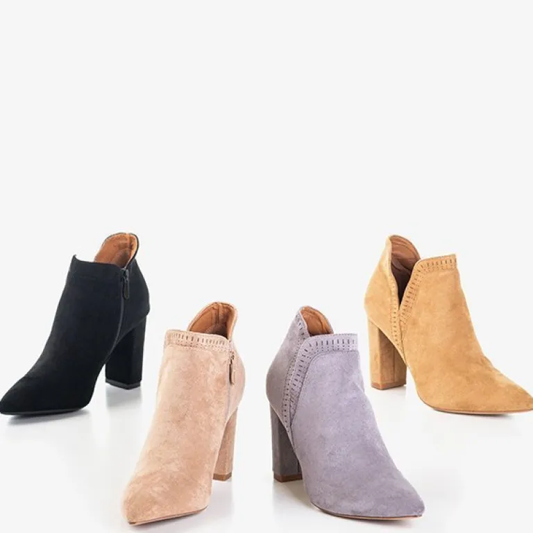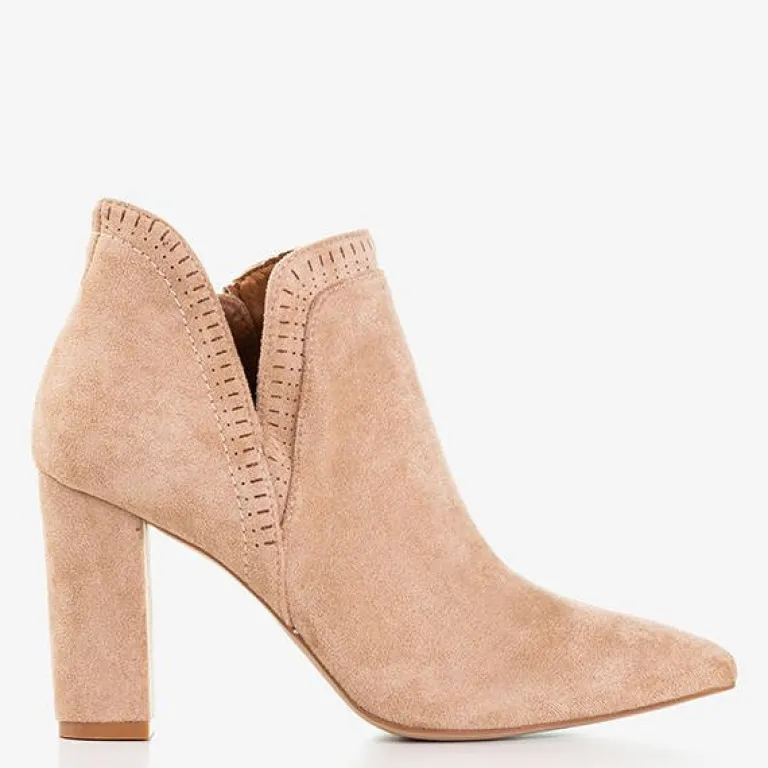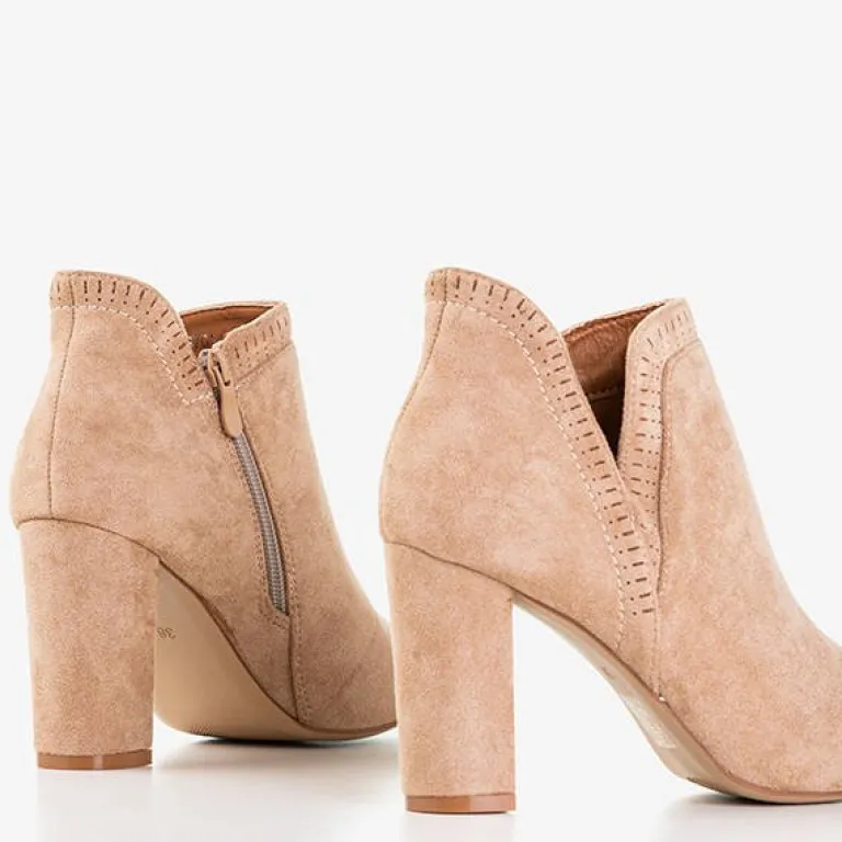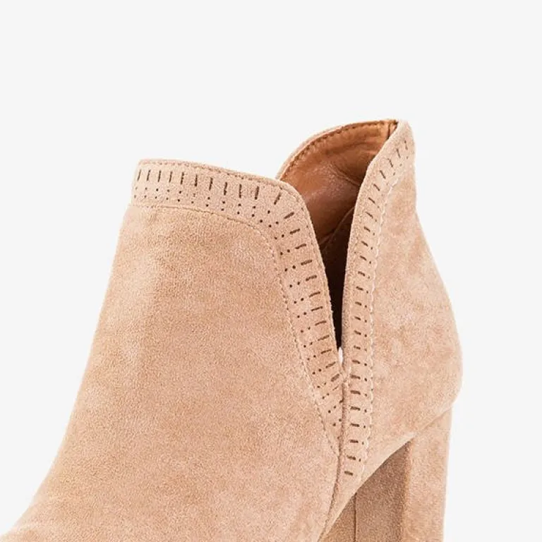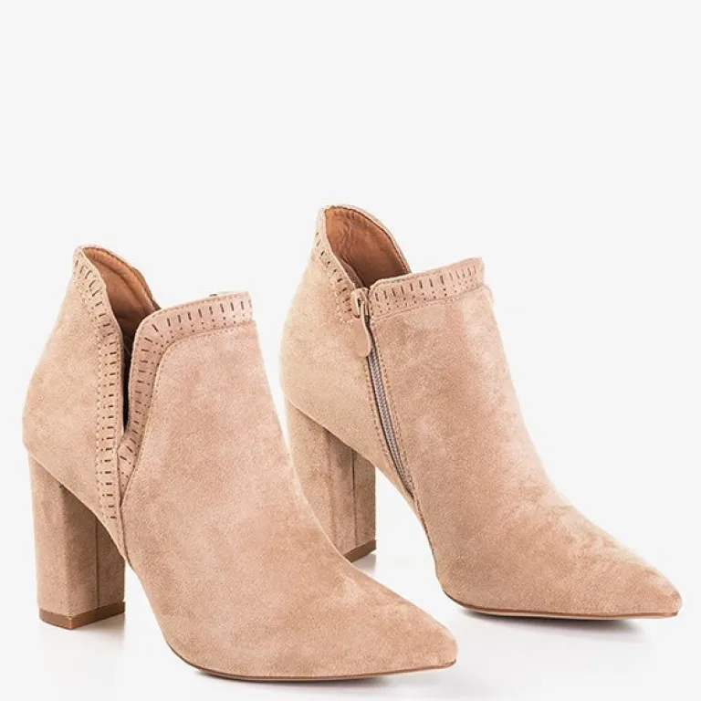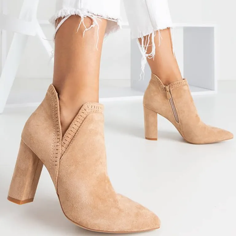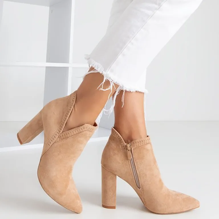 - Rewelacyjne botki na wysokim obcasie w kolorze jasnobrązowym. Cholewka wykonana z miękkiego eko-zamszu, zaś wkładka pokryta tkaniną. Nosek zakończony w szpic, który optycznie wyszczupla nogi. Model zapinany na suwak po wewnętrznej stronie.