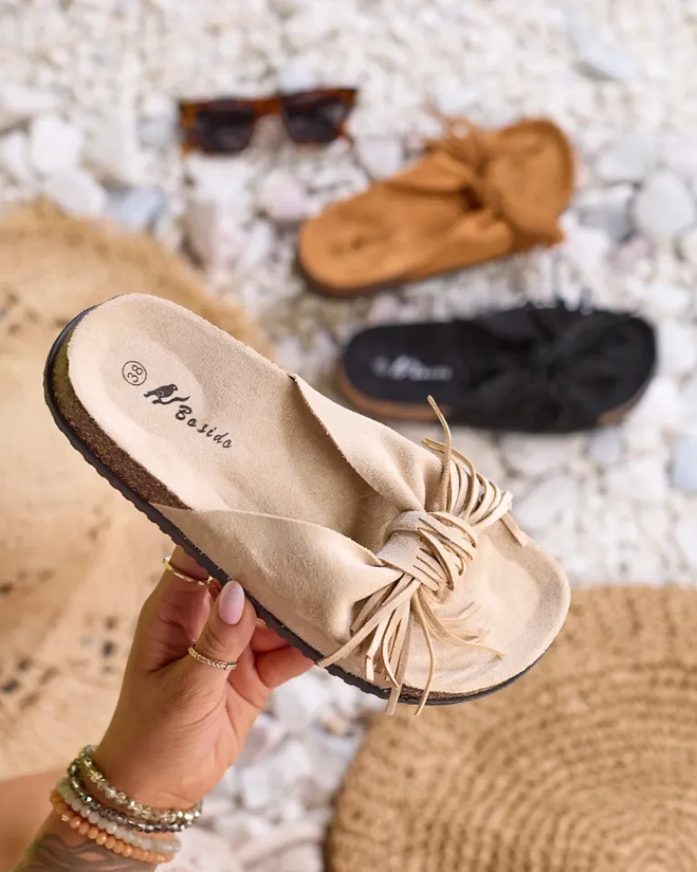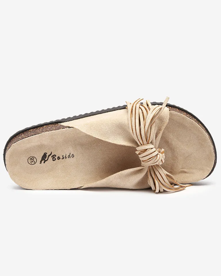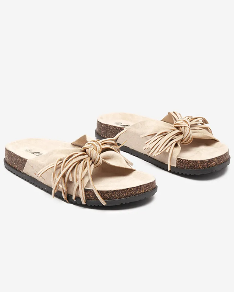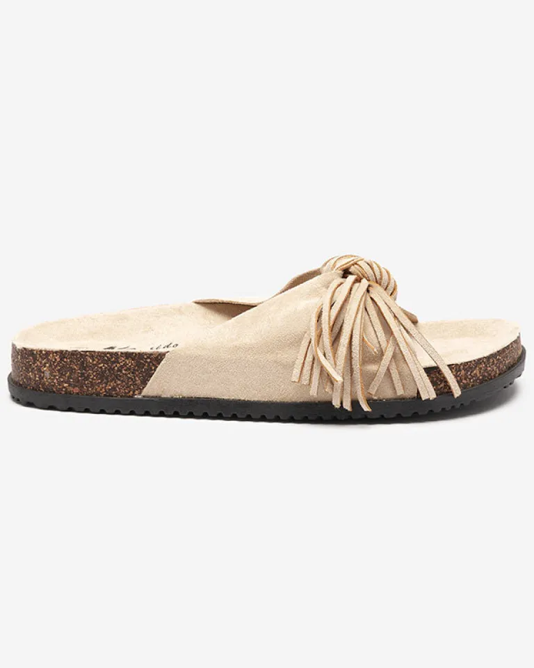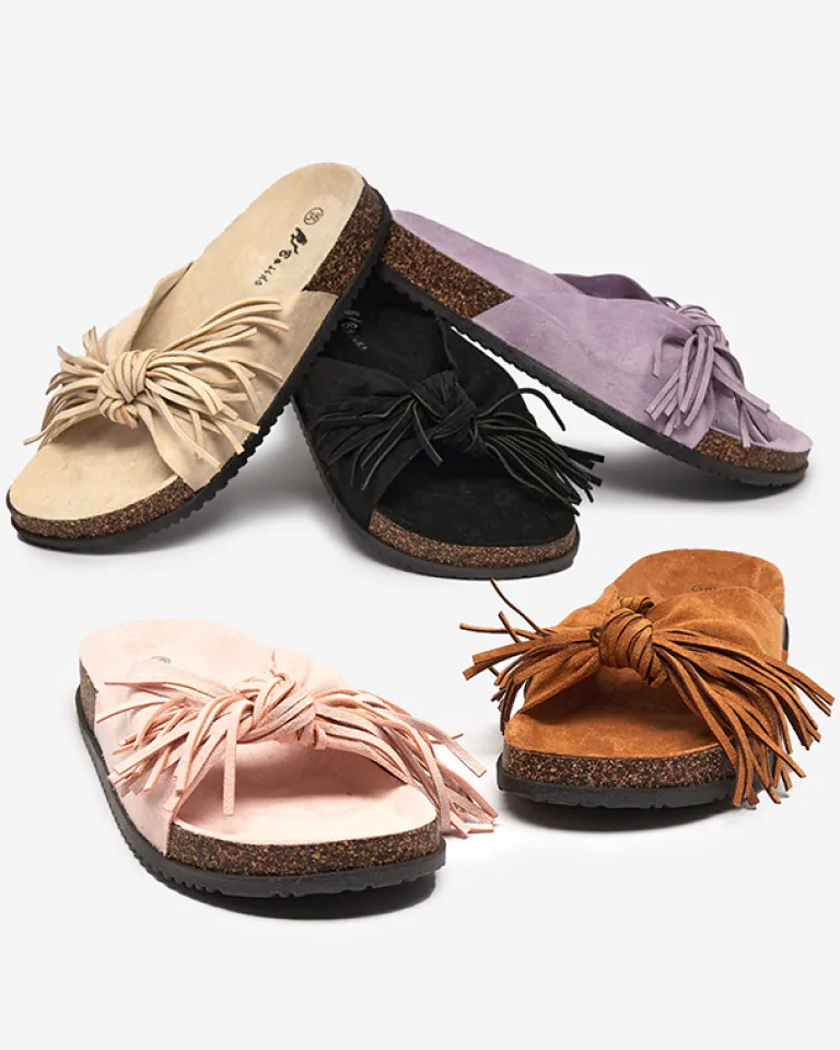 - Eleganckie klapki damskie ze skóry ekologicznej zamszowej, zdobione frędzelkami. Gumowa podeszwa zdobiona materiałem a’la korek. Perfekcyjny dodatek do niemal każdej stylizacji! UWAGA: model może posiadać śladowe ilości kleju przy podeszwie.