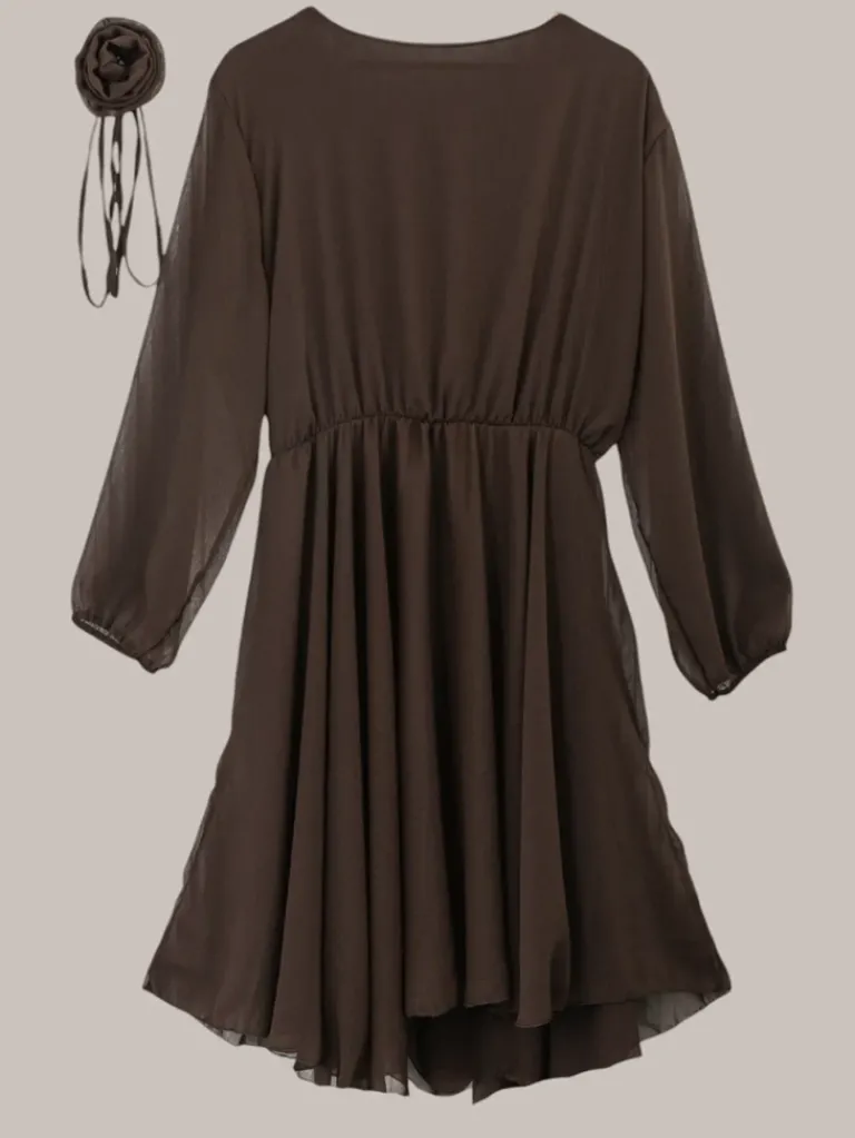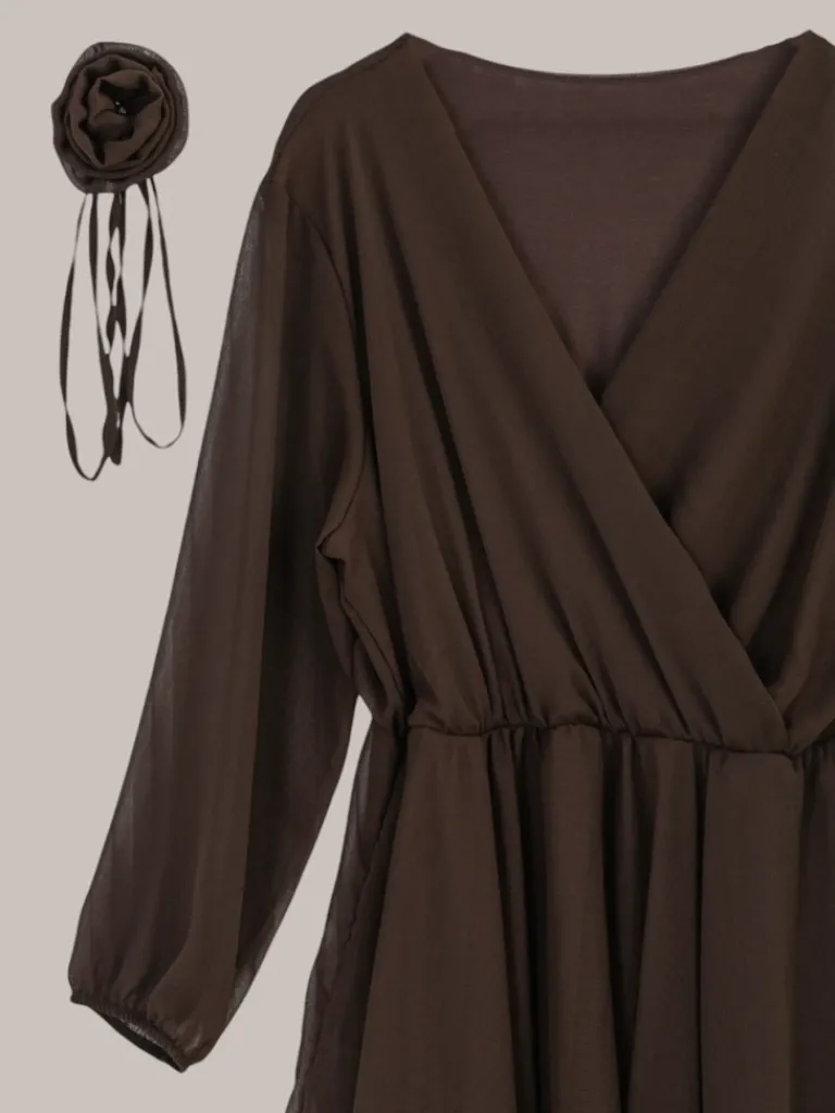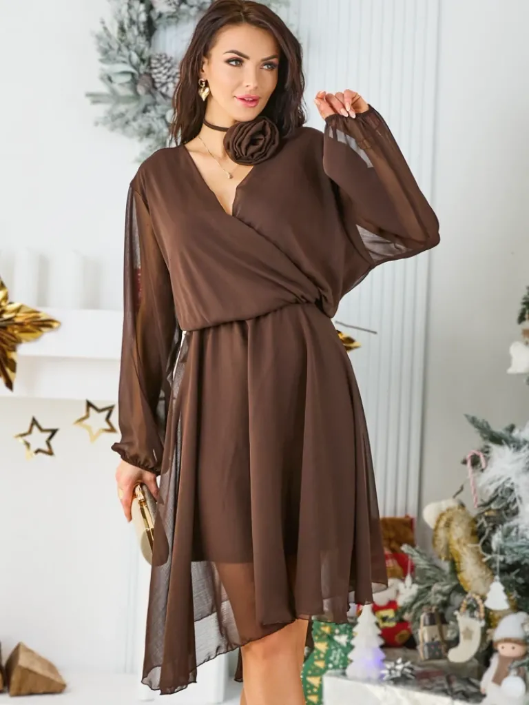 - Elegancka, ponadczasowa damska sukienka przed kolano, posiada kopertowy dekolt i gumę w talii. Sukienka z długimi rękawami z siateczki i ozdobnym, dodatkowym wiązaniem z kwiatem. Świetna propozycja na wieczór!