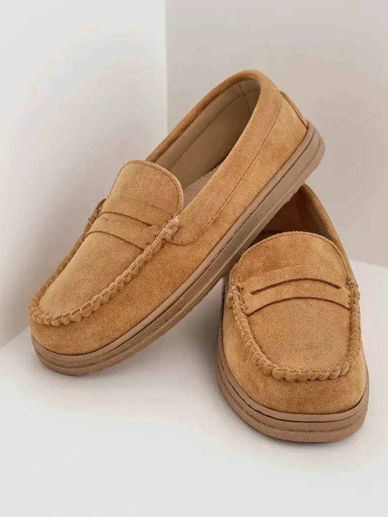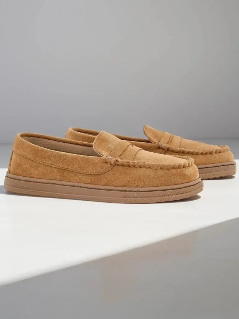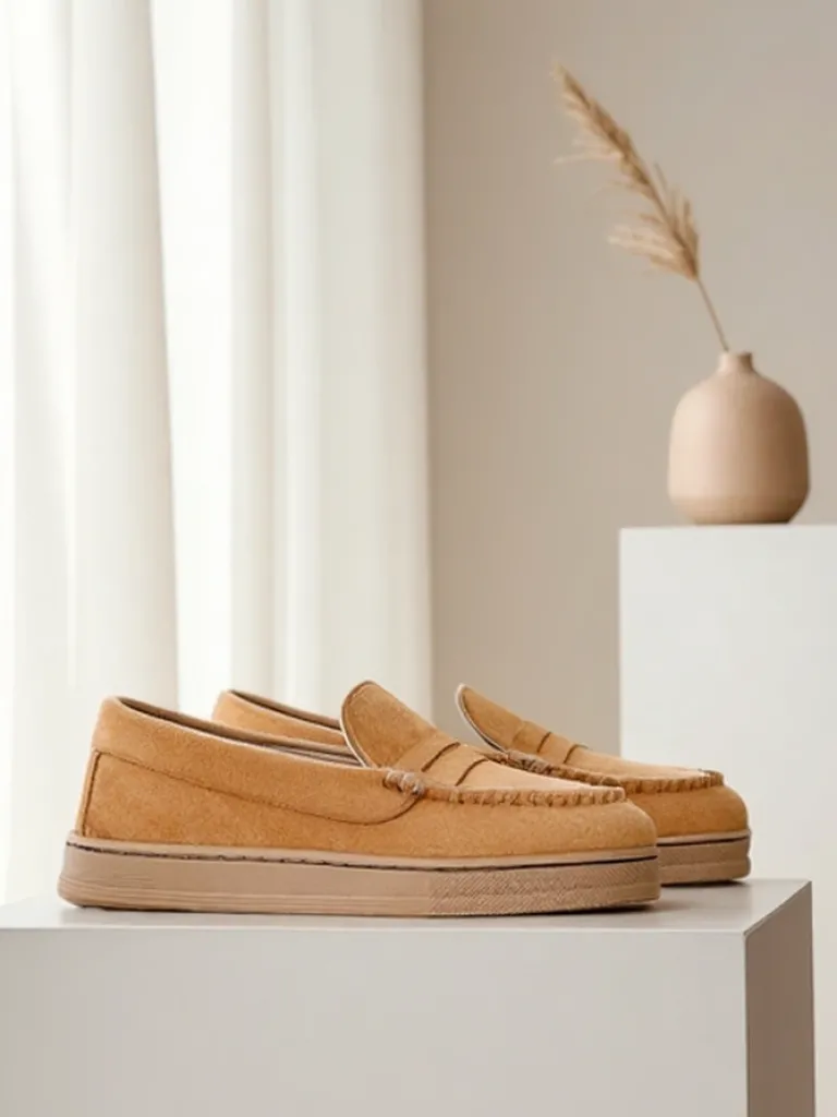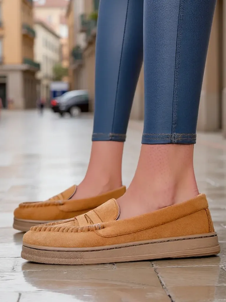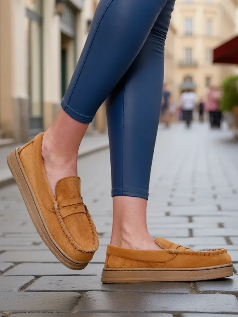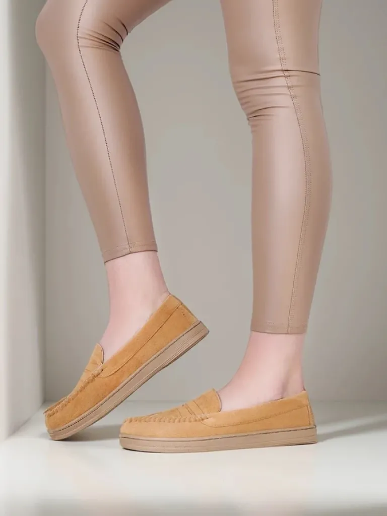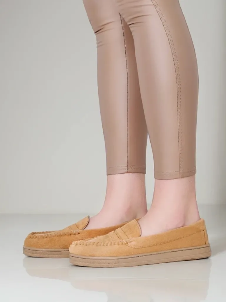 - Modne damskie mokasyny na płaskiej podeszwie. Para jest wykonana ze skóry ekologicznej zamszowej. Środek wyłożony miękką tkaniną. Idealne do casualowych outfitów!