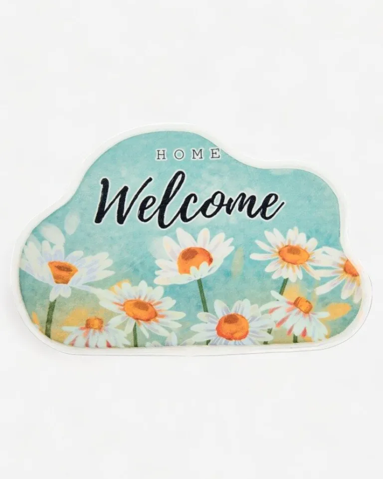 - Mały kolorowy dywanik wycieraczka z krótkim włosiem i napisem ” Welcome Home”. Jest miękki i delikatny, przez co niezwykle przyjemny w dotyku. Dodatkowym atutem dywanu jest jego antypoślizgowy spód.