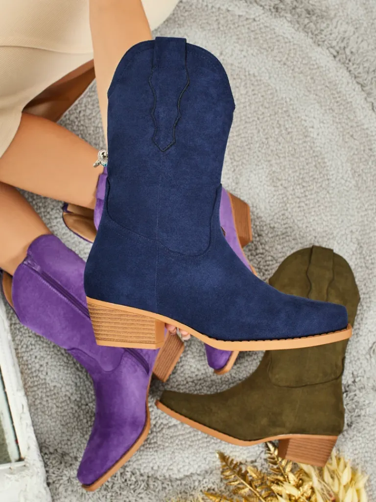 - Botki a’la kowbojki na płaskim obcasie, wykonane ze skóry ekologicznej zamszowej. Wkładka tkaninowa, buty zapinane na zamek. Pasują do wielu kobiecych stylizacji!