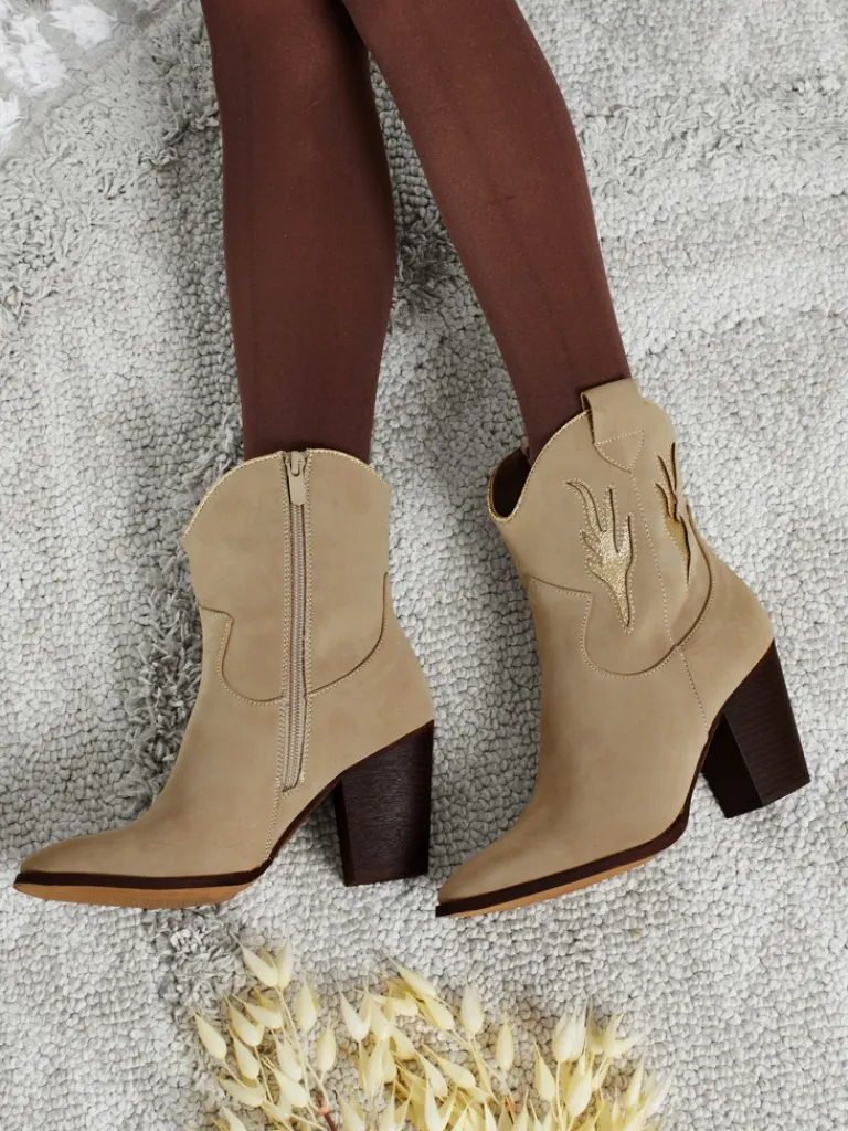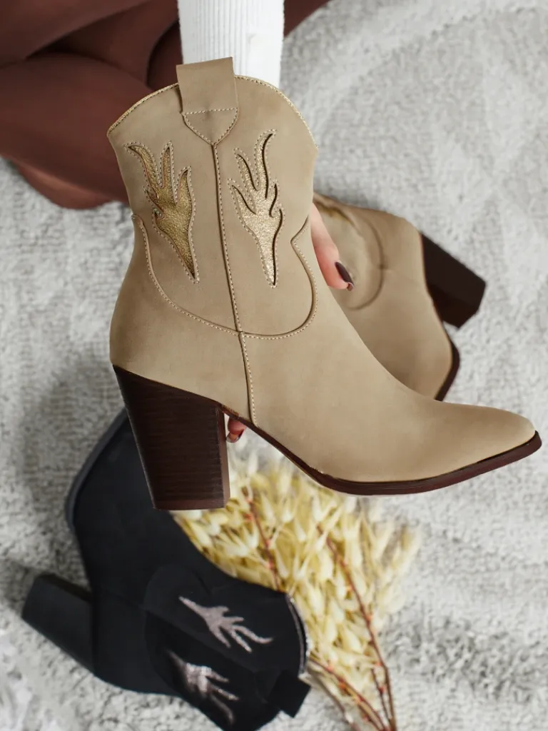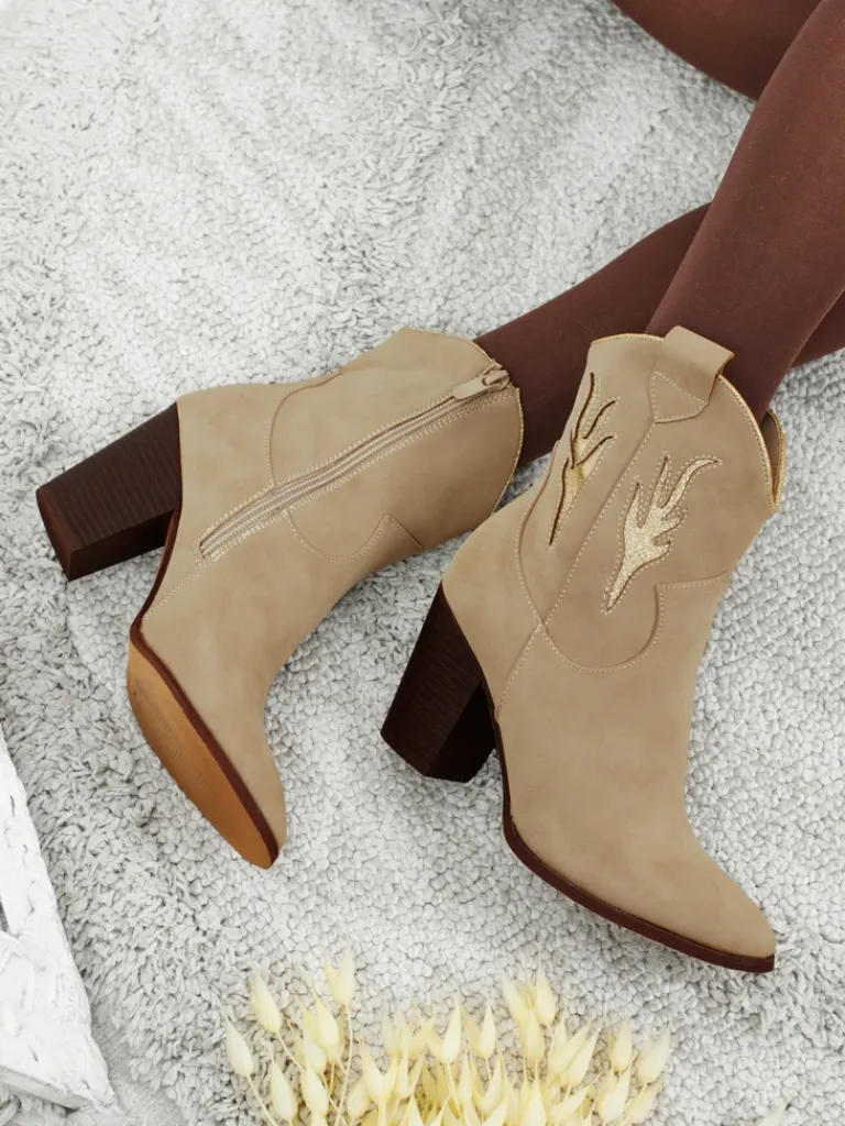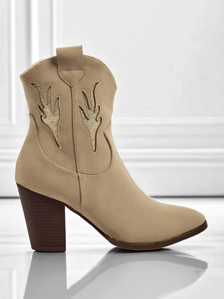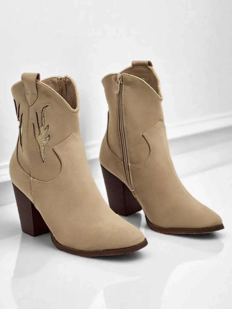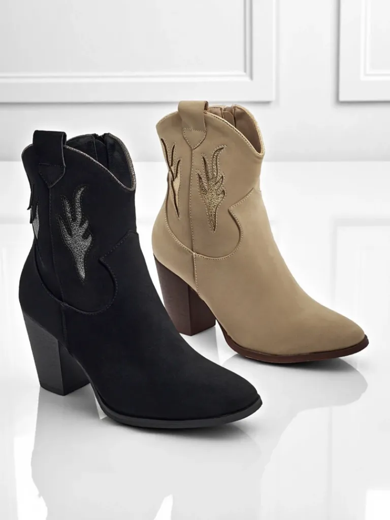 - Botki a’la kowbojki na obcasie, wykonane ze skóry ekologicznej matowej. Środek ocieplany futerkiem, buty zapinane na zamek z ozdobnymi wstawkami z brokatem. Pasują do wielu kobiecych stylizacji!