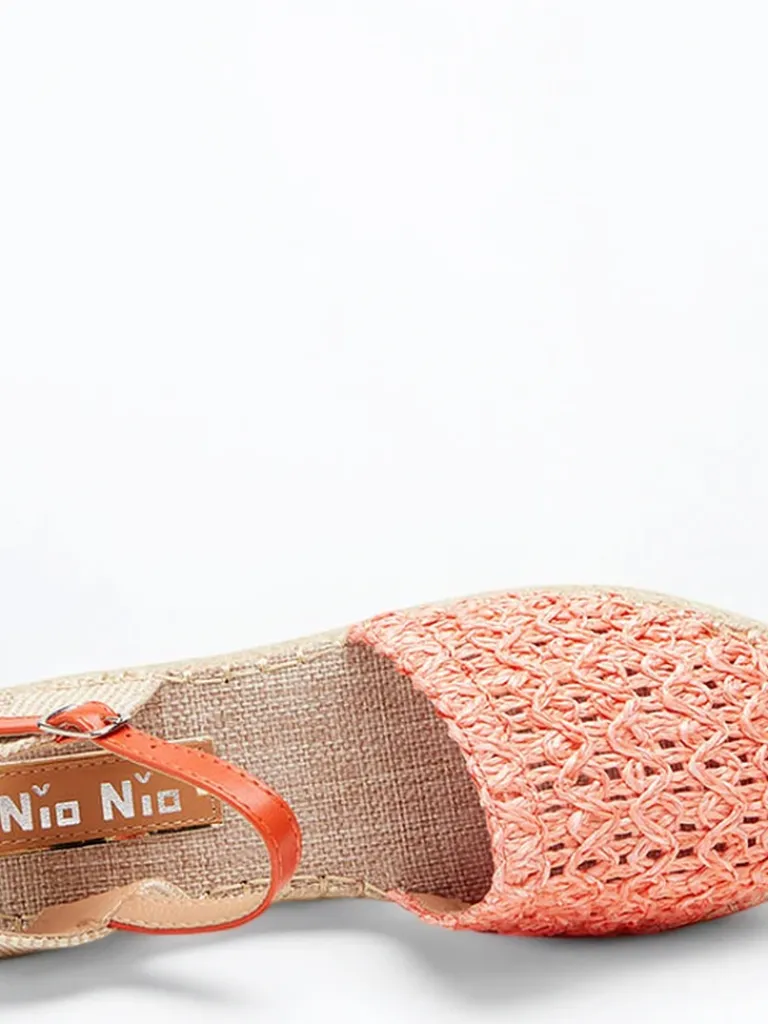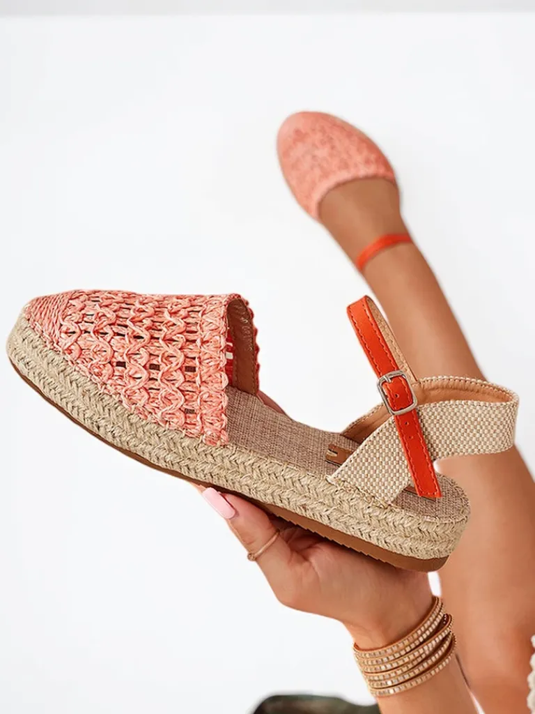 - Pomarańczowe damskie espadryle na niskiej platformie. Cholewka wykonana z tworzywa sztucznego. Podeszwa wokół zdobiona plecionym sznurkiem jutowym. Model zapinany sprzączką. Władka tkaninowa. Idealne na lato.