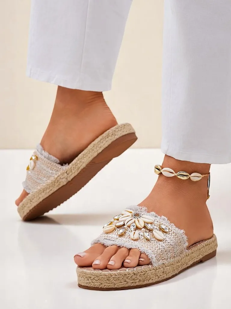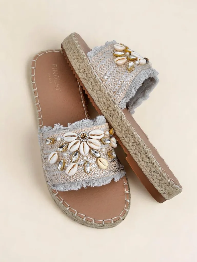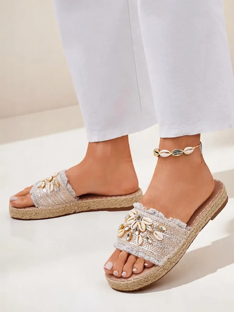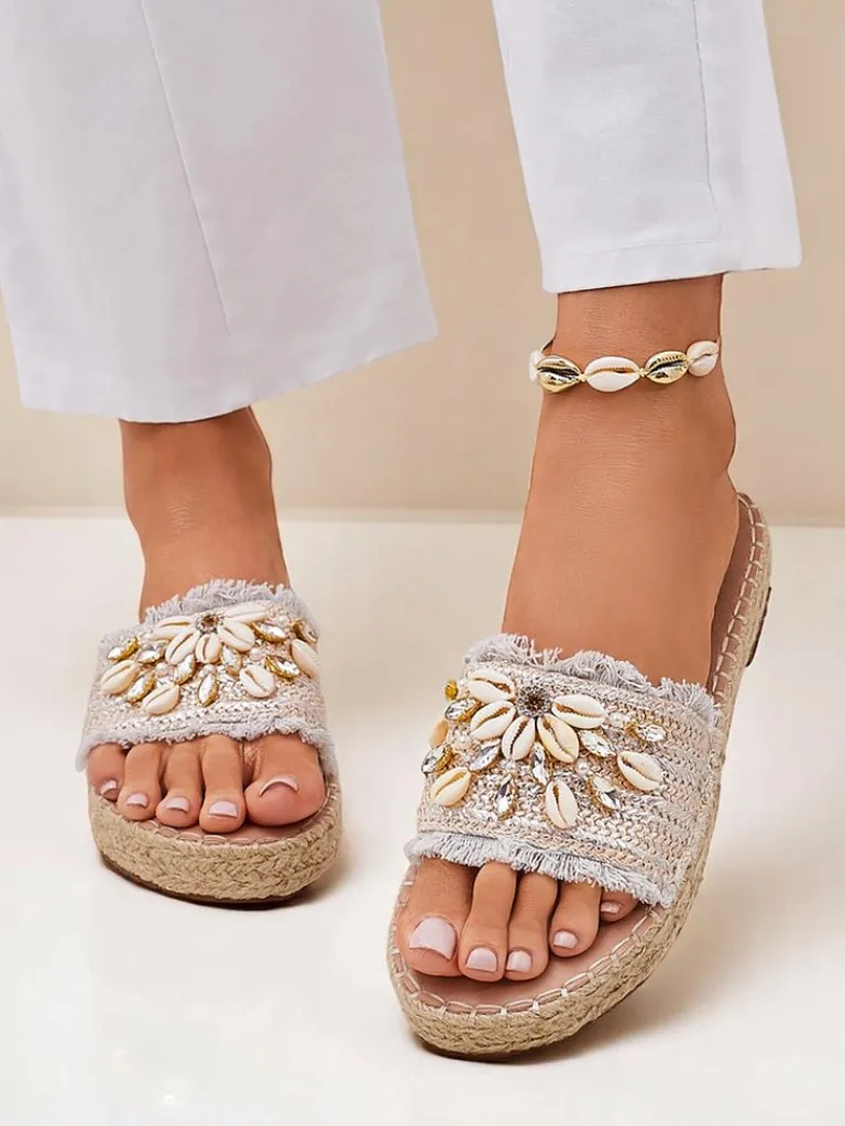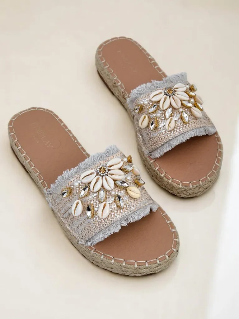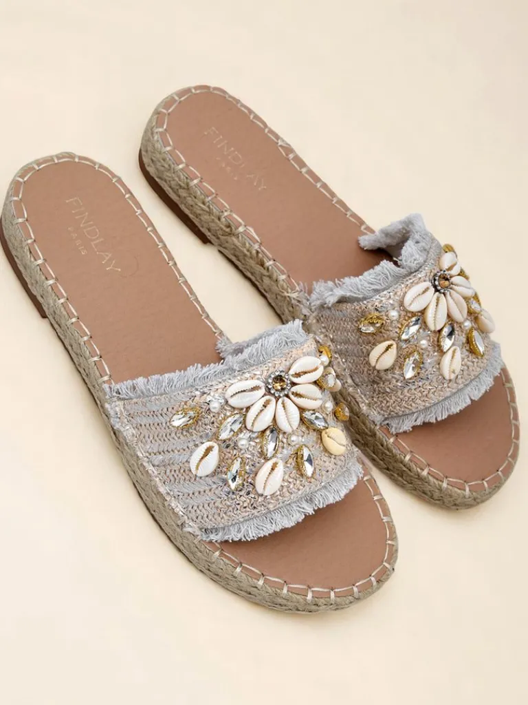 Clearance Sandały damskie Perseida srebrne z muszelkami na płaskiej podeszwie Klapki Płaskie