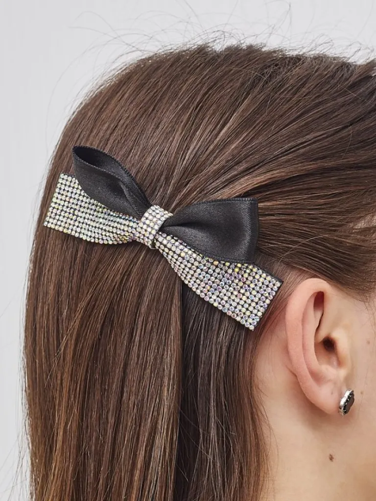 - Spinka do włosów z kokardką ozdobioną cyrkonią. Elegancki i błyszczący akcent do fryzury — idealna na specjalne okazje, dodaje klasy, blasku i kobiecego uroku.